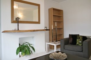 Used a chunky piece of oak this week to create a mantelpiece in Project BB, above a very sad looking hole which once housed a 1950’s gas fire and now tenants pop in pebbles and tea lights. I sanded it down and brackets, hidden behind chiselled out plaster then filled over, support it so it looks like it’s floating.