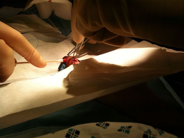 Off to Hope today to get a biopsy for the ‘It isn’t Lyme so what the hell is it?’ on my hands. All my fingers have got these very annoying lesions on them so one of the dermatologists wanted a biopsy. I found it fascinating, though it means my hand is out of action for a week. Again. They found it weird that a) I wanted to watch and b) popped out the iPhone to get some snaps. They used a weird looking vertical hole punch thing to slice down and then had to hook up the skin and cut it off, yum yum haha