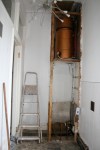 Another busy day… lovely hotel style shower room finished to replace the hideous and endlessly problematic bathroom which was there before. Below is the view to where the old cistern boxing off was: the huge copper tank which took ages to heat up and was very inefficient has been removed and replaced by a small hot water heater (see previous blog!). The bath has gone, so a much small literage of water is required for the basins in the kitchen and bathroom, hence not needing a whopping great cistern anymore. The electric shower runs off a cold feed so not hot water required there.