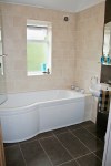 The cost of something like this should be around £4k; to include rip out, new stud, joinery, re-plumbing, provision of basic bathroom suite (here we used Stax for the WC , basin, mirror and taps approx £200 in total, bath & screen was approx £340), some electrical work, tiling to walls and floors, design and project management.