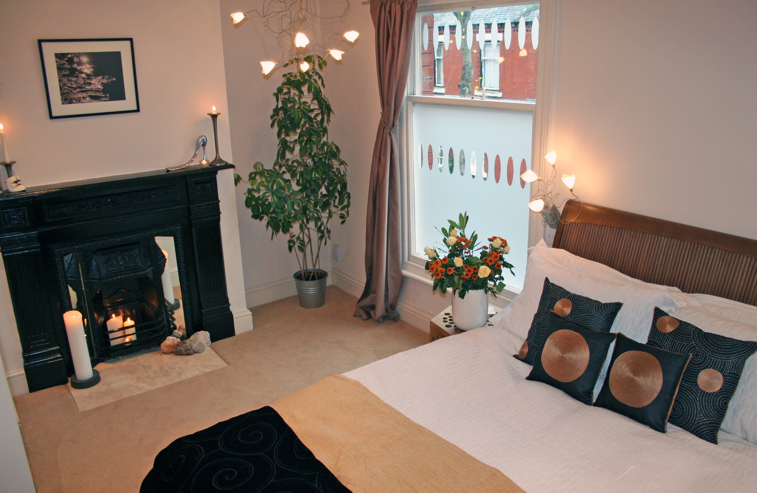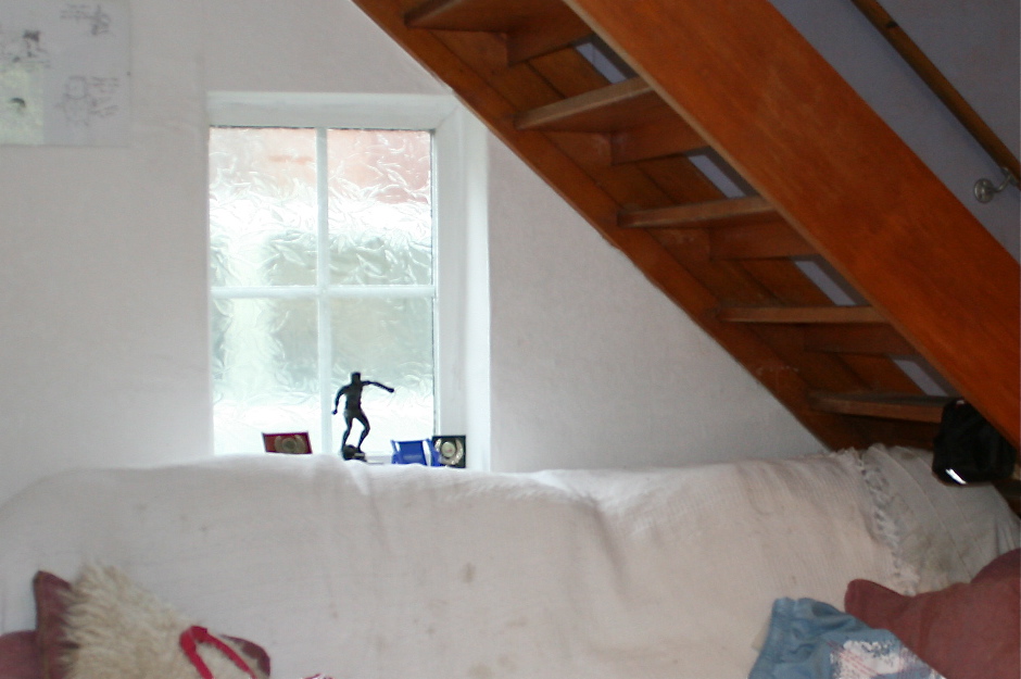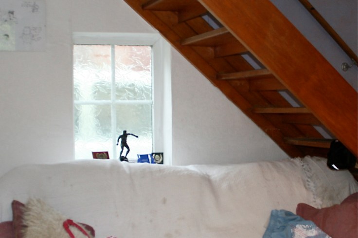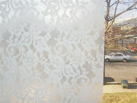 So what to do? A few years ago I renovated a house where the large North facing sash windows faced onto the street and the students in the house opposite could gaze into the room, which was going to be my bedroom, not good. So I had a company make cut some window film to the size of the window, with an oval cut pattern. ‘Scuse the dire temporary curtains below, I haven’t many images of this house, pre the digital age! The film was fantastic, we didn’t have to close the curtains during the day, yet the room was still light and private.