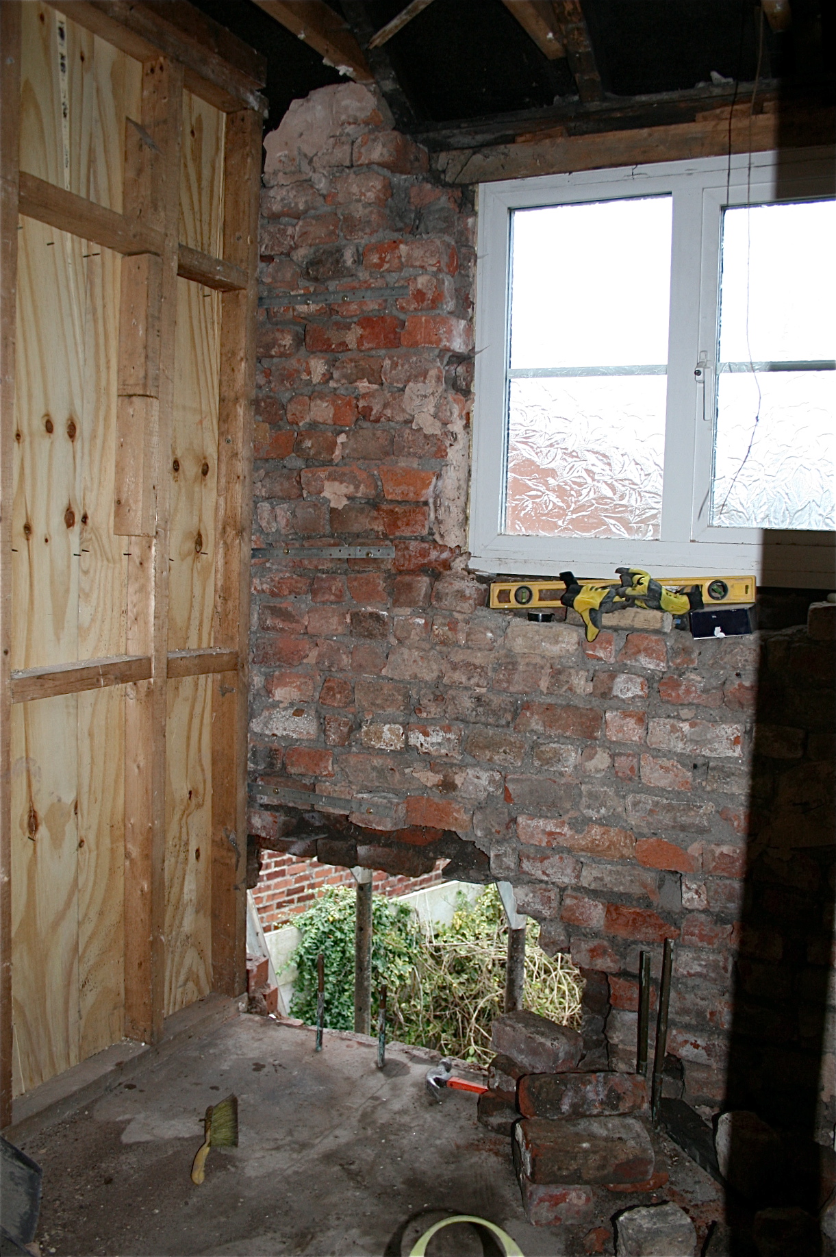 We are on with it though, the rotten beam is gone, and the guys are busy bricking up the hole with reclaimed bricks so it will be safe, secure and good as new. It’s very odd, all these funny timber lintels everywhere, makes me think the cottage was once a barn or store and has been converted to a house at some stage in the past, will have to get Hannah to investigate the deeds. Next job, getting those gutters fixed!