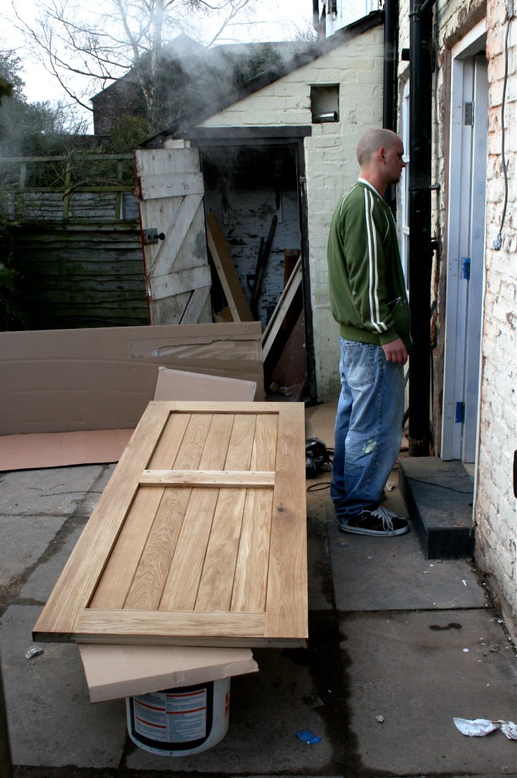 The bedroom and bathroom doors arrived from UK Oak Doors and are just magnificent, so solid and traditional looking, quite the nicest doors I have ever ordered. They’re a frame and ledge door, Suffolk Style, and feel about a zillion times more sturdy than the frame and ledge ones on offer in local diy stores. As they’re solid oak doors, they’ve to be treated once on site and a pot of the recommended Treatex Hardwax oil – made using natural sustainable raw materials – was enclosed. Together with the eggshell drying and slate seal upstairs, the combined fumes nearly knocked me off my feet but it was way too21 cold at 9pm to open up the door and windows, so I just got high, determined to get the first coat on all the doors before the joiner man-handled them the next morning. You can see from the image above the difference in depth of colour just one coat of the oil made – it enhanced the grain of the oak beautifully. Took me two hours to do the three doors, front and back, before my back said enough, my stomach demanded food and my brain imploded.