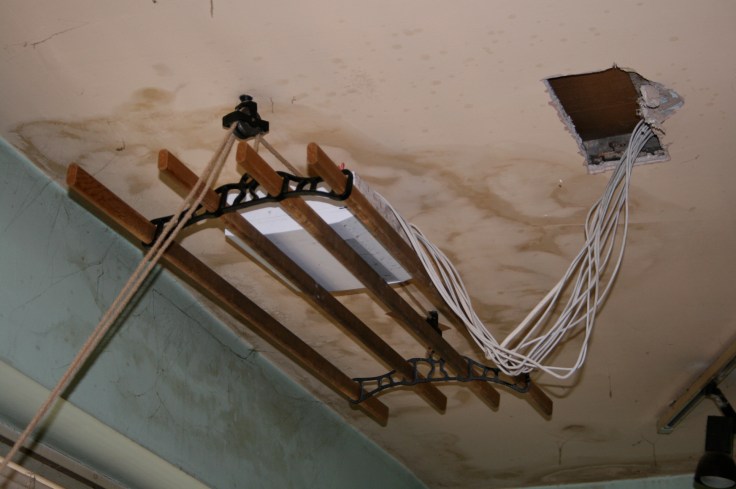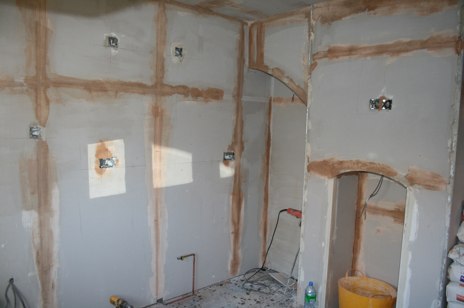 Whilst over at Goulden, the upstairs bathroom was ready to be plastered but for some weird and wonderful reason, the alarm engineers had positioned the control box in the water tank cupboard which has now been removed, so it’s totally in the way of the new bathroom design. The below manoeuvre involved me standing on a chair with a cardboard box on my head whilst Mr M cut a hole in the floor to pass the alarm box down through the kitchen ceiling, so it can be repositioned in one of the kitchen cupboards. Sod’s Law dictated there wasn’t enough cable to just neatly and temporarily fix it to the green wall so it’s balanced on the top of a laundry rack until the kitchen is ripped out next week!