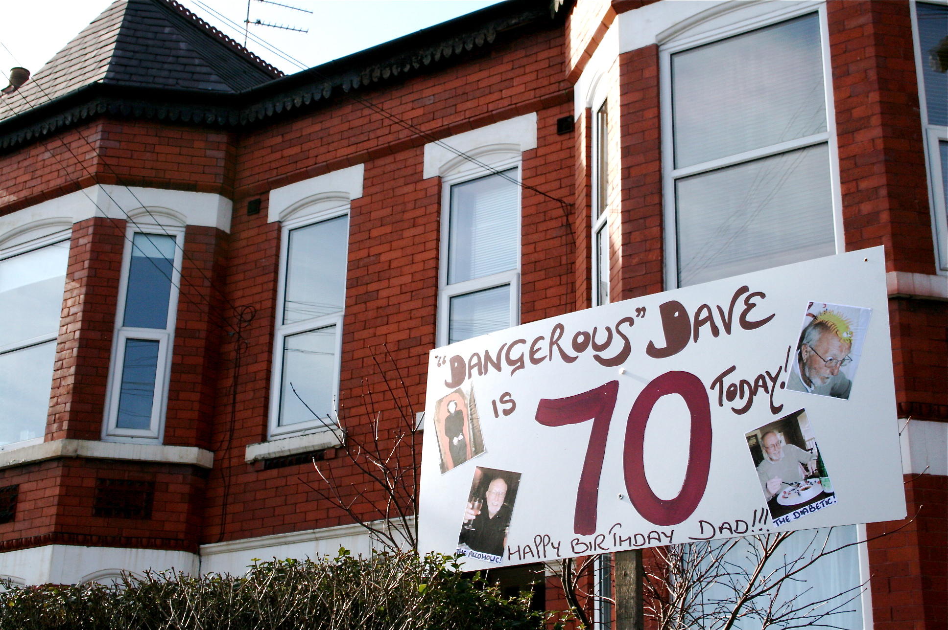 In between planning the kitchen for Brighton, sorting the end panels for Belford and calling into Goulden, a sneaky poster was required to embarrass my dad who hit three score years and ten today. God knows how the man known as Dangerous Dave has made it to this ripe old age without someone or something killing him (I may blog his back catalogue of disasters one of these days, suffice to say he lasted 2hrs as a milkman before his full milk float ended up at the bottom of the steepest hill in Blackburn) but he has, and we all love him for it.