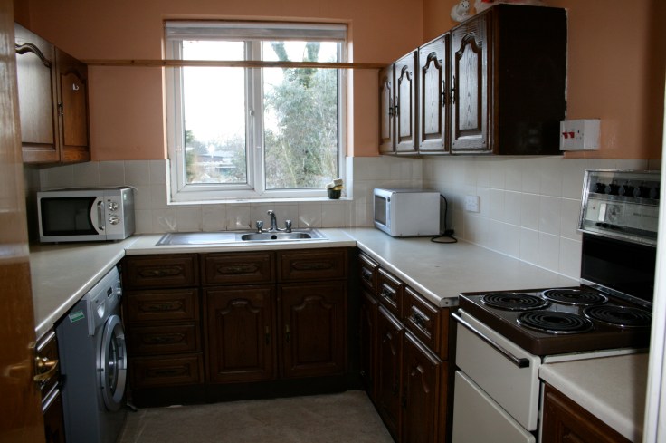 Left hand side of kitchen, tumble drier and washing machine to go under cabinets, sink under the window