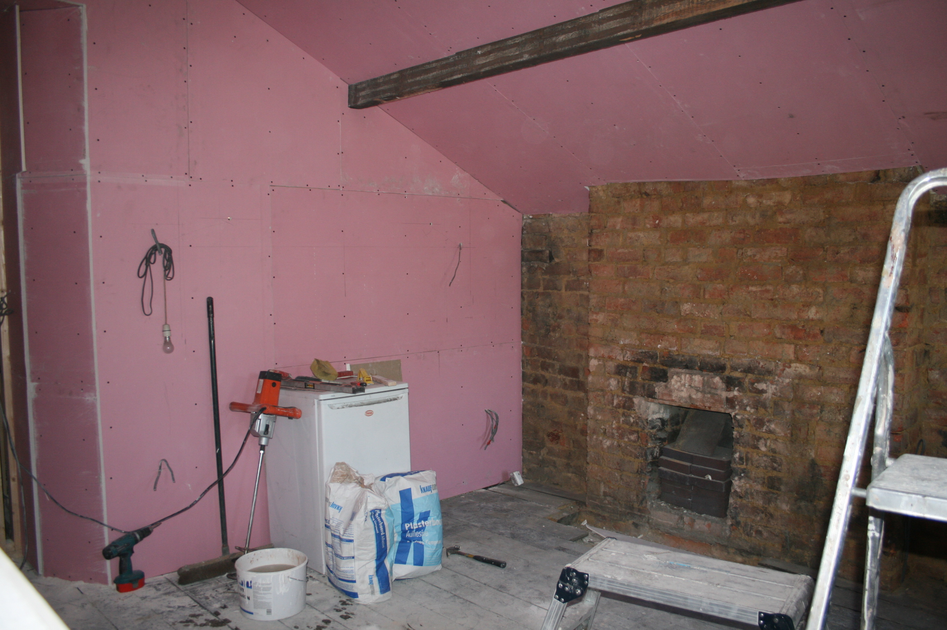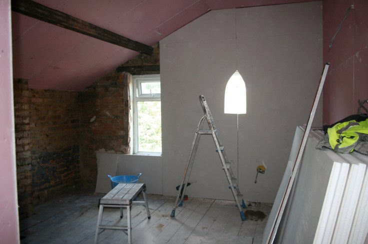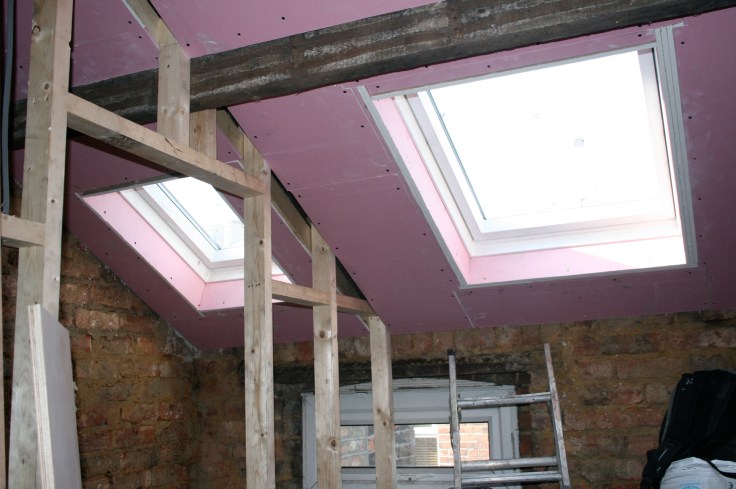 The living room is being boarded and they left me a little Polish joke - cutting a church window into the plasterboard 🙂