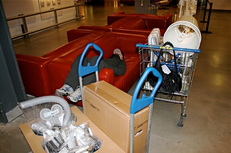 Even I, with my honed-over-years-Ikea-stamina, gave up last night and collapsed back in the waiting room in Ashton. Yet another kitchen ordered, picked, hoisted onto trolleys (Mr Moregeous’s job), lugged through the tills, then dragged over to DHL (with their extortionate delivery prices). Oh, I yearn for the good old days when you didn’t have to pick a thing, just gave your list in at the til and it was magically delivered the next day, but am now resigned to that never happening again. My poor back needed stretching out so there was nothing else for it but to utilise the furniture.