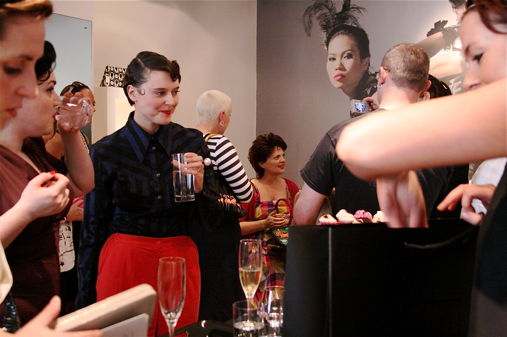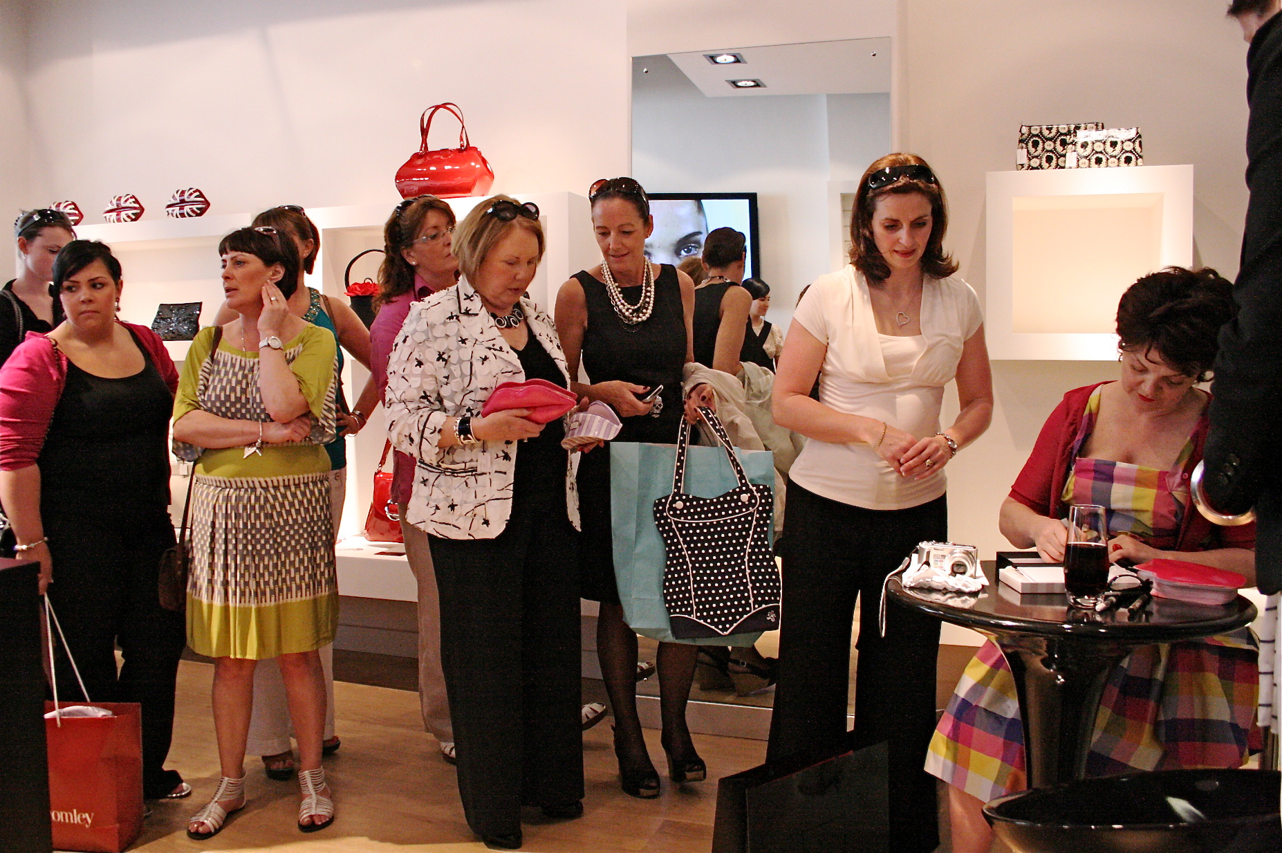 The temperature was hot hot hot day today as Stylisa and I headed into Manchester for a Poshu afternoon hosted by Lulu Guinness, the acclaimed British handbag and accessories designer. Lisa was very excited as this is her world of fashion and style, I was simply along for the ride and the cupcakes 😉 Nice to get a Friday afternoon off too, though after this morning’s financial property panic meltdown, leading to hugeous maximus Moregeous tears, I needed it! All was well after a few mini-chocolate bites of heaven and tonight I will go to bed dreaming of a gold, sparkly, lip-shaped clutch. Unusual for someone said to buy bricks, not handbags 🙂 Mr Moregeous, take heed! Lulu was very gracious and very sweet, having to sign bags and purses for a shop full of over-excited fans with a smile for everyone. It was interesting that she noted there was only Lisa who style-blogged, clearly fashion events in London and elsewhere are full of guest-listed bloggers, but not so much here. A lovely afternoon, thanks Poshu x