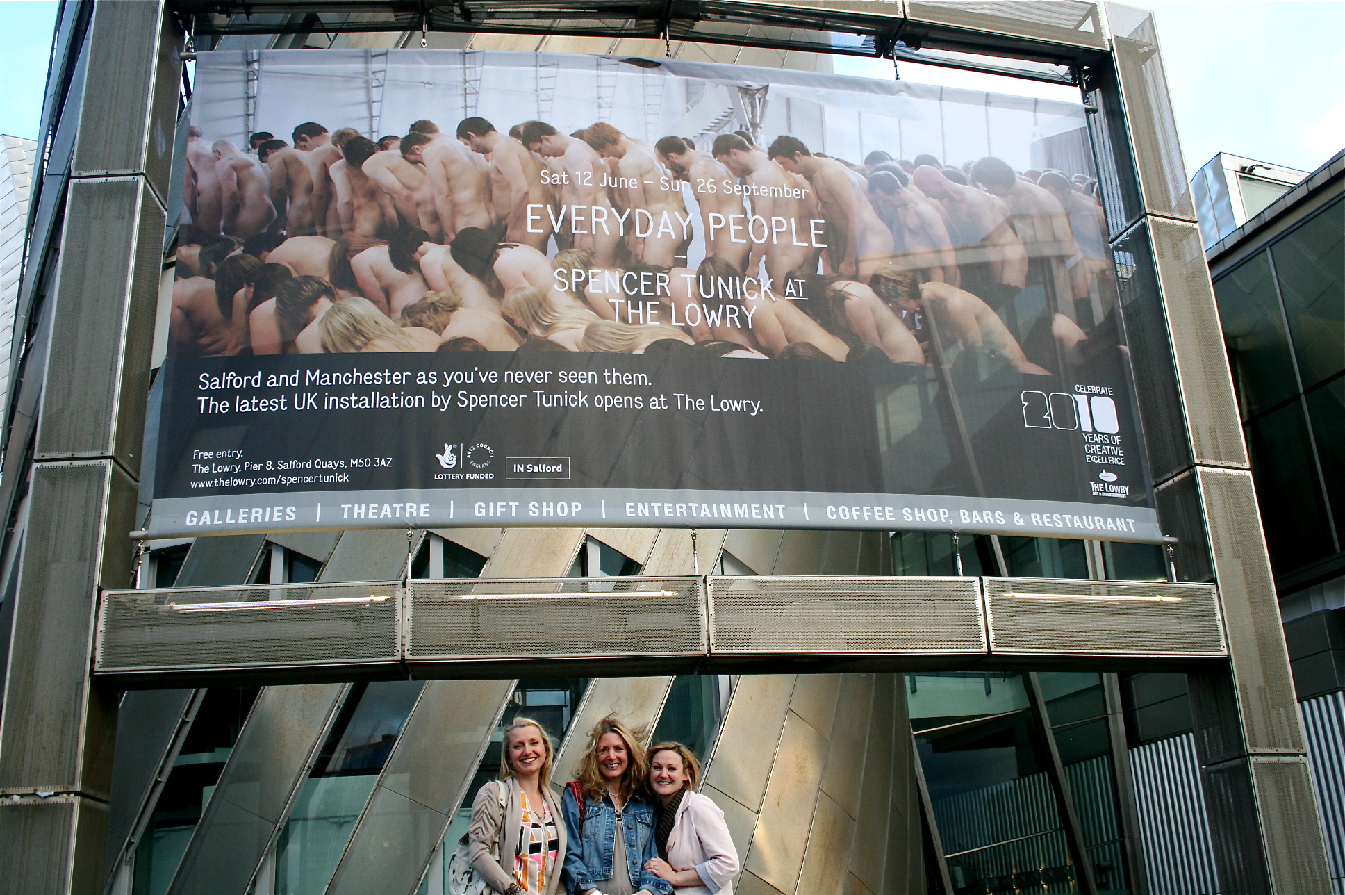 Even with stomachs full of butterflies, we girls downed a glass of wine (for nerves) and a delightfully large Cafe Rouge pudding each (for the hell of it), before crossing over to The Lowry on the launch night for Ordinary People. Just a few weeks earlier we’d all been butt naked in the name of art on those very stone flags and just the thought of it made us giggle as we headed in to see the exhibition. We didn’t quite know what to expect and there were contradictory feeling as though we were apprehensive at the thought of spotting ourselves, at the same time we wanted to almost as if that was ‘proof’ we were really there. It didn’t take blinking long as the huge promo shot plastered on the Lowry tower featured our naked backs before we’d even got into the building!