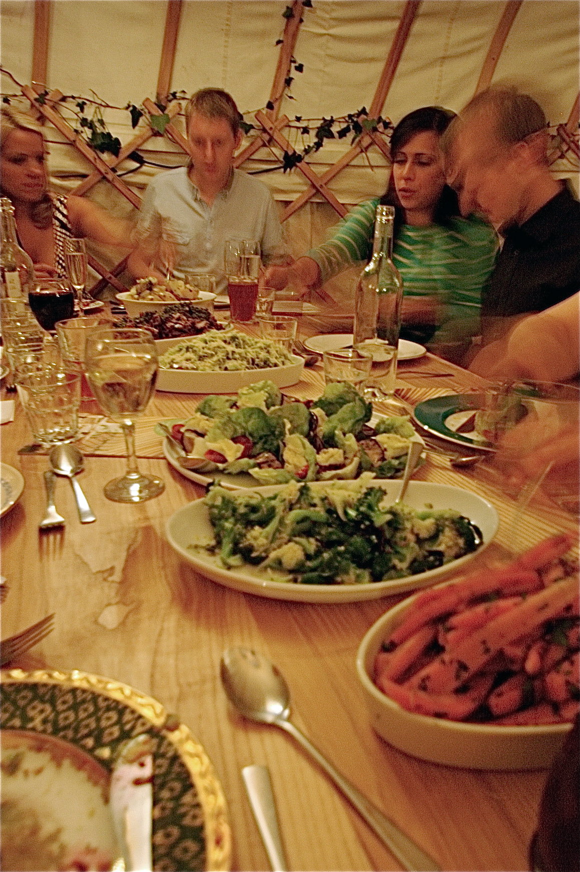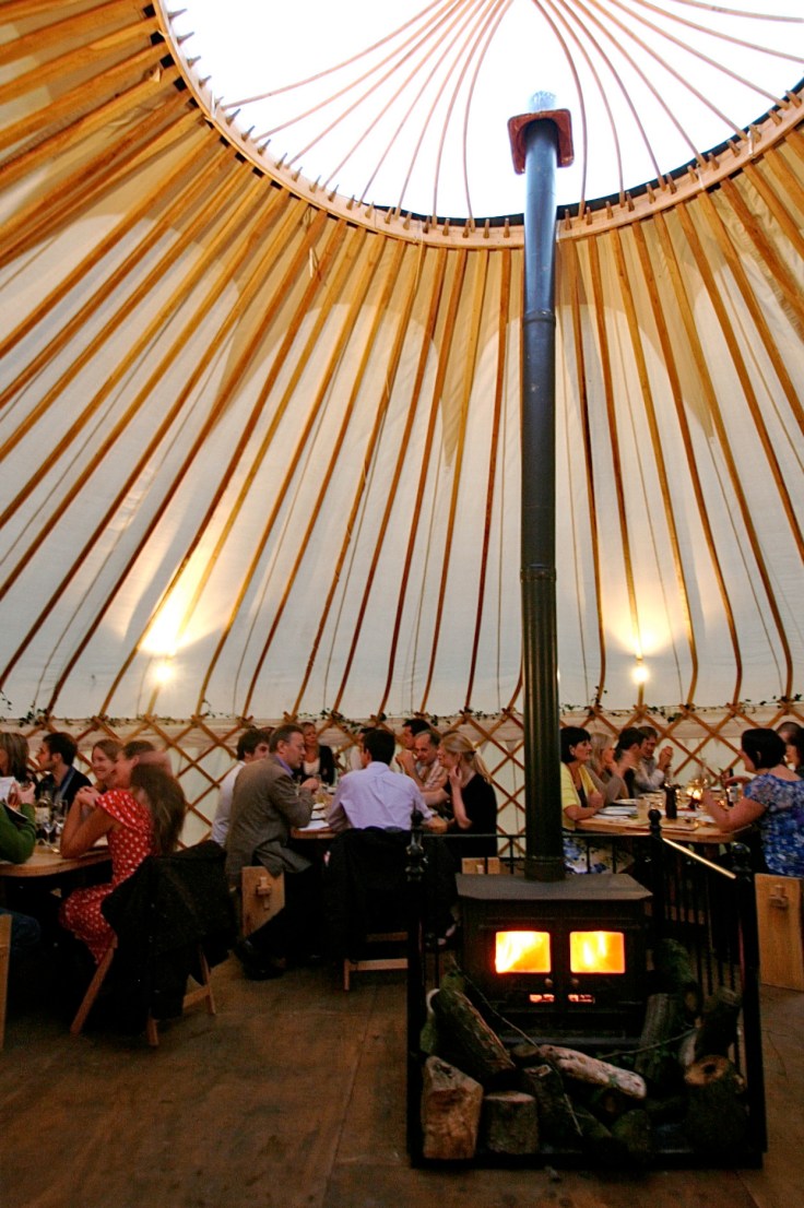 How amazing are these images, part of the structure was covered and part open, with a large wood burning stove in the middle. The crockery was perfectly eclectic and mis-matched, the table decor delightfully natural and the shape and feel to the yurt elegant, sweeping and unforgettable.