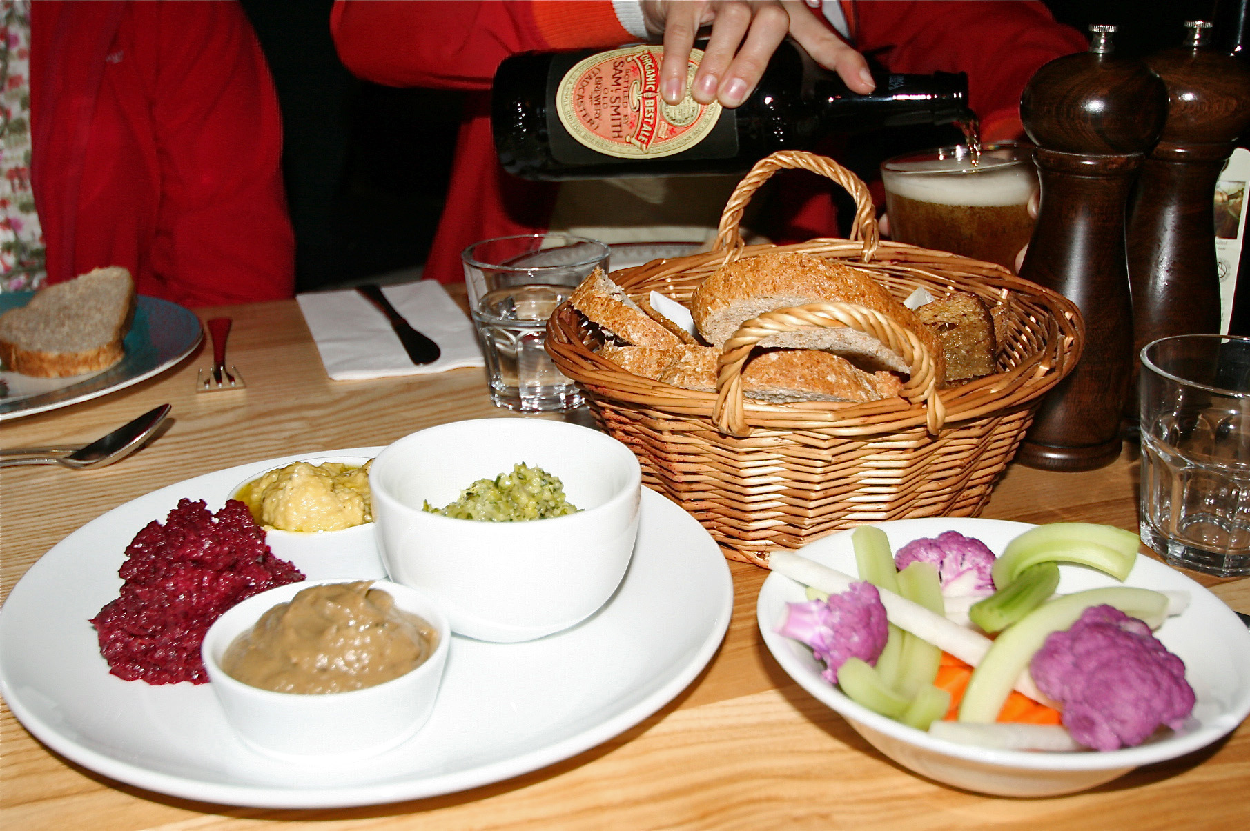 Could it get any better?! Er, yes, the food. Oh my lord, the food. It was spectacular, bursting with flavour and unusual combinations. Below was our first course nibbles – crunchy veg and fresh bread with beetroot & balsamic vinegar dip, baba ganoush (smoky aubergine), a broccoli dip and hummus, all fresh, home grown and just delicious. Check out the recipes on the Riverford web-site.