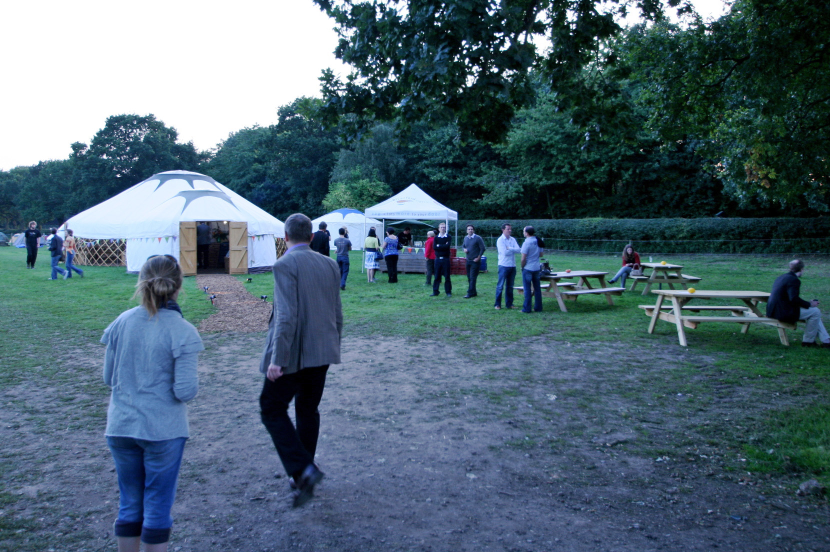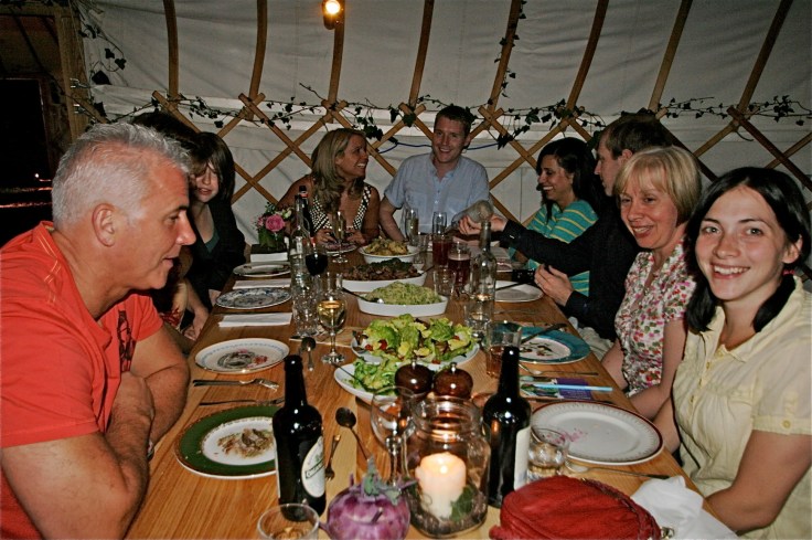 Stomach’s were grumbling now and we were all dying to see inside, so an orderly queue formed and in we went. It was really well organised and just such a lovely experience to be milling around with drinks outside on a balmy evening, then wander into this huge tent for what was a surprise meal as no-one had a clue what was to be served….