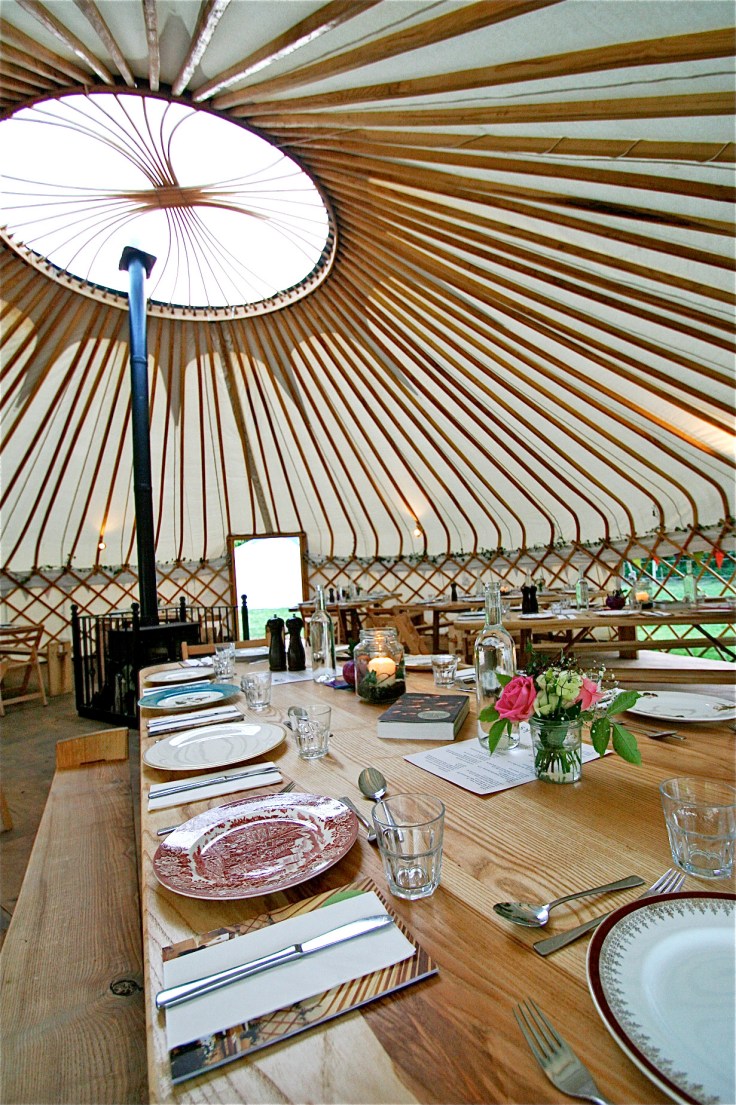 Finally we reached Arley Hall (home to the country’s first herbaceous border, thank you Jonathan) and hung a left to the estate’s 750 acre organic Stockley Farm, temporary home to the Travelling Kitchen. The Yurt was in sight, and what a sight, a circular tent with a lattice frame carved from ash from the trees at Riverford’s Wash Farm in Devon. Traditionally a nomadic structure in Central Asia, Guy Watson used one for a staff party and the idea was born to take one out on the road, genius!