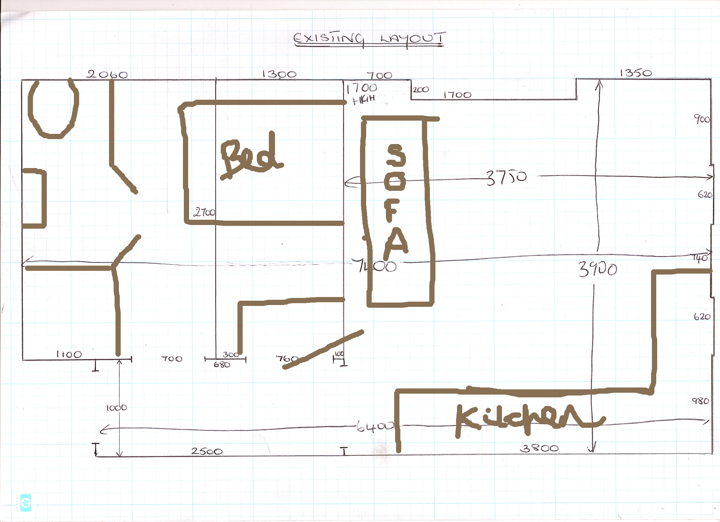 This is a very rough outline of ‘before’ with some scrawled photoshop writing to show you the new layout (yeh yeh, I’ll get onto CAD someday soon!). The main entrance and hallway remained the same, originally the apartment’s single bed was where the new kitchen is marked, the new bed is marked over where the bathroom used to be, and the new shower room over what was the kitchen. There were a few limitations in that the only wall with any height (ie over 2m) in the apartment is the one with the kitchen on it, the ceilings slope down to only 1700 high from that bottom long wall below to the top long wall (with the chimney breast on it). Plus there are two windows on the right hand wall, so the kitchen position was pretty much fixed in where it had to go.