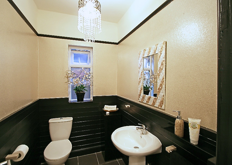 IMG_9932The panelling was knotted, undercoated and painted in Dulux Night Jewel 1 and the walls in Dulux Light and Space Frosted Dawn. The picture rail framed the Akoya mother of pearl wallpaper, the sanitary ware was re-installed, the tiled floor stripped and grout lines cleaned, and the John Lewis Ariella chandelier fitted. All done at the click of a finger 😉2016-02-08_0002.jpg