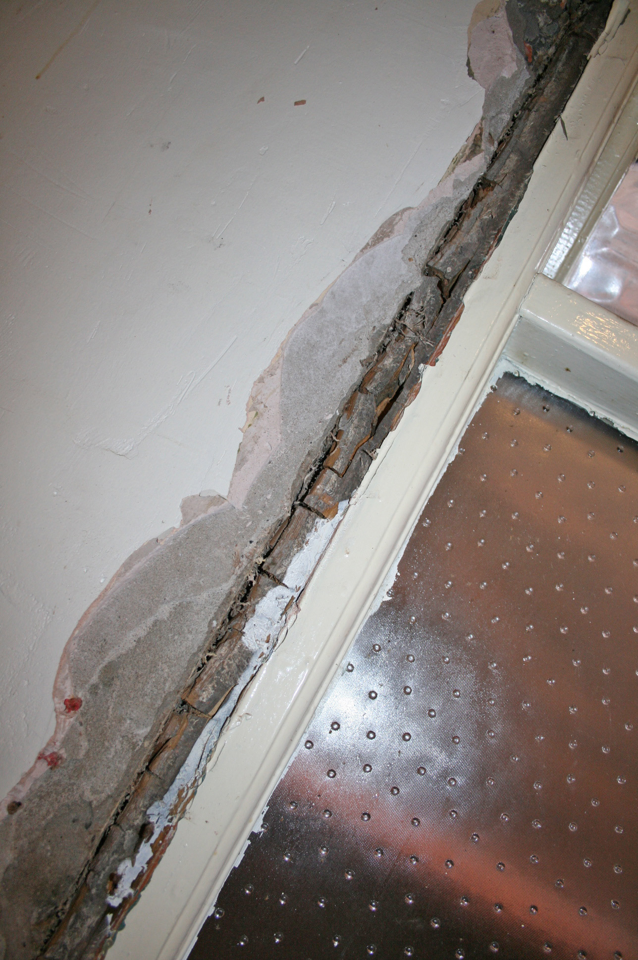 But somehow the architraves around the window looked a bit manky and even though they looked fairly solid, they just seemed a bit uneven and I wasn’t happy with them so recommended we fit new ones. Some subconscious niggle of instinct must have kicked in, because when we took off the architraves, this is what we found – large cuboidal cracking all the way up the left hand side of the frame…..