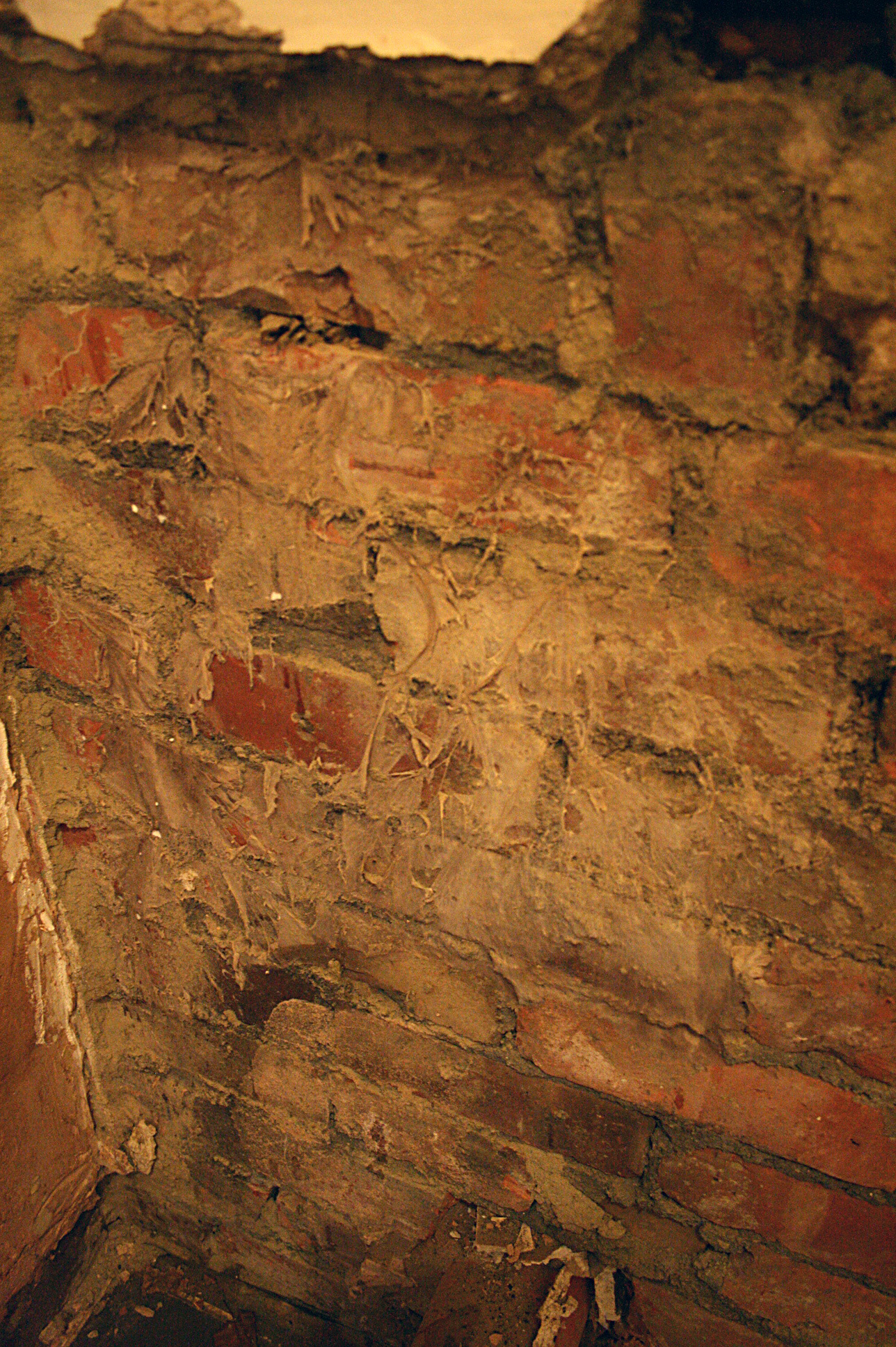 IMG_9791Strands and webbing called mycelium (similar to extra thick cobwebs) covering the brick work behind the plaster below the opening….