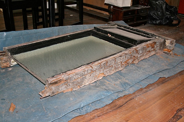 IMG_9794_2We took out the window to find even more evidence that the frame had been eaten alive by dry rot, serpula lacrymans, and one side of the once solid timber was now a shrivelled, cracked mess 😦