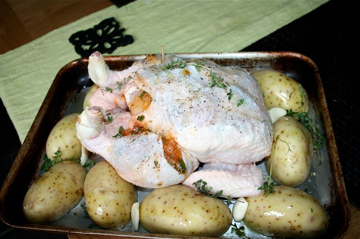 So, back to lunch and a little experiment. A whole chicken where I’ve stuffed the skin to meat section with a chilli and parsley pasta sauce, surrounded by baking potatoes, olive oil from Crete, garlic cloves and lemon thyme. Smells good so far but looking a bit pale…… roll on 2pm…