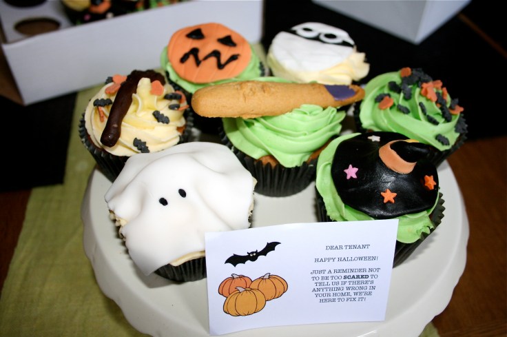 Inspired by the AWFUL landlords on last week’s Panorama, we’ve been busy catching up on all the little jobs and to-do’s for our rentals this week. Ok, I’ve been in the office doing the accounts but also making lists as Mr M valiantly works through them. God, I love him. As a ‘Happy Halloween’ and also a reminder to let us know of any issues in their flat, I dropped off an Airy Fairy spooky cup-cake with one of the notes above to each of our tenants. Nearly all. I forgot one flat and I therefore hope they don’t read this. Of course we saved a couple….. if anyone annoys me, they’ll be getting one of these pointed threateningly their way….