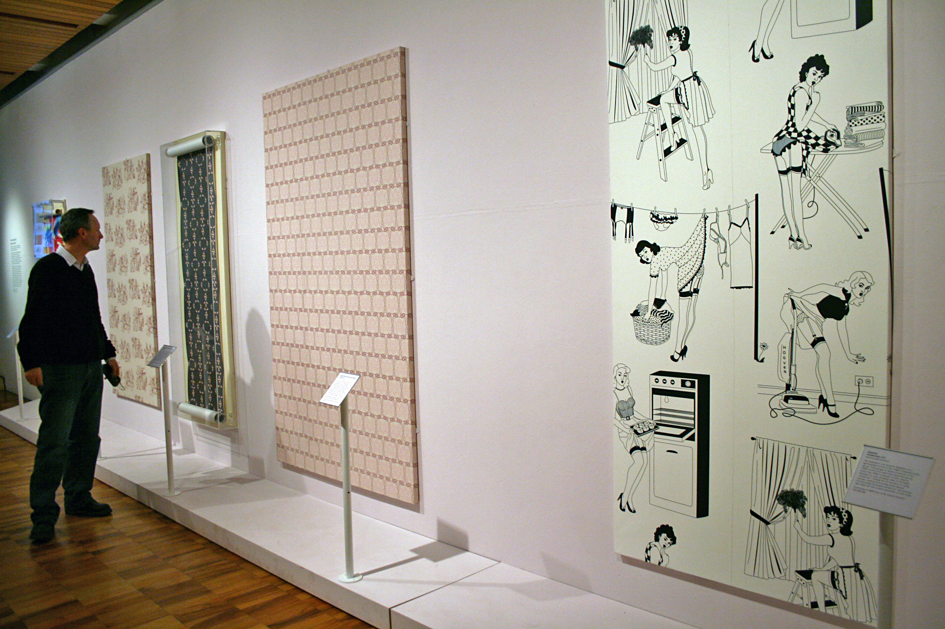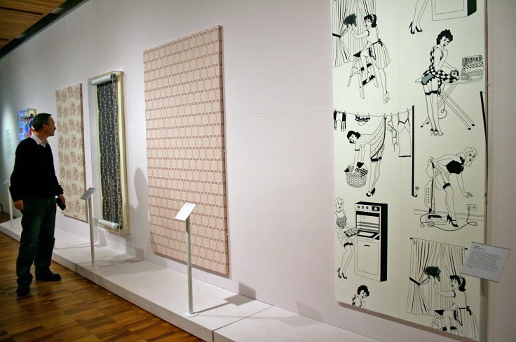 As well as featuring stereotypes and celebrities, the exhibition includes many one-off or limited edition artworks. Artists such as Robert Gober, Niki De Saint Phalle and Allen Jones knowingly play with visual representations of sex, celebrity, machismo, pornography and childbirth. Made for a domestic setting where gender roles are played out, wallpaper is the perfect medium to highlight and question these repeating patterns.