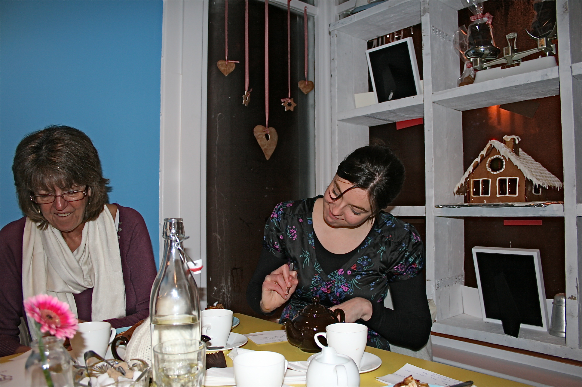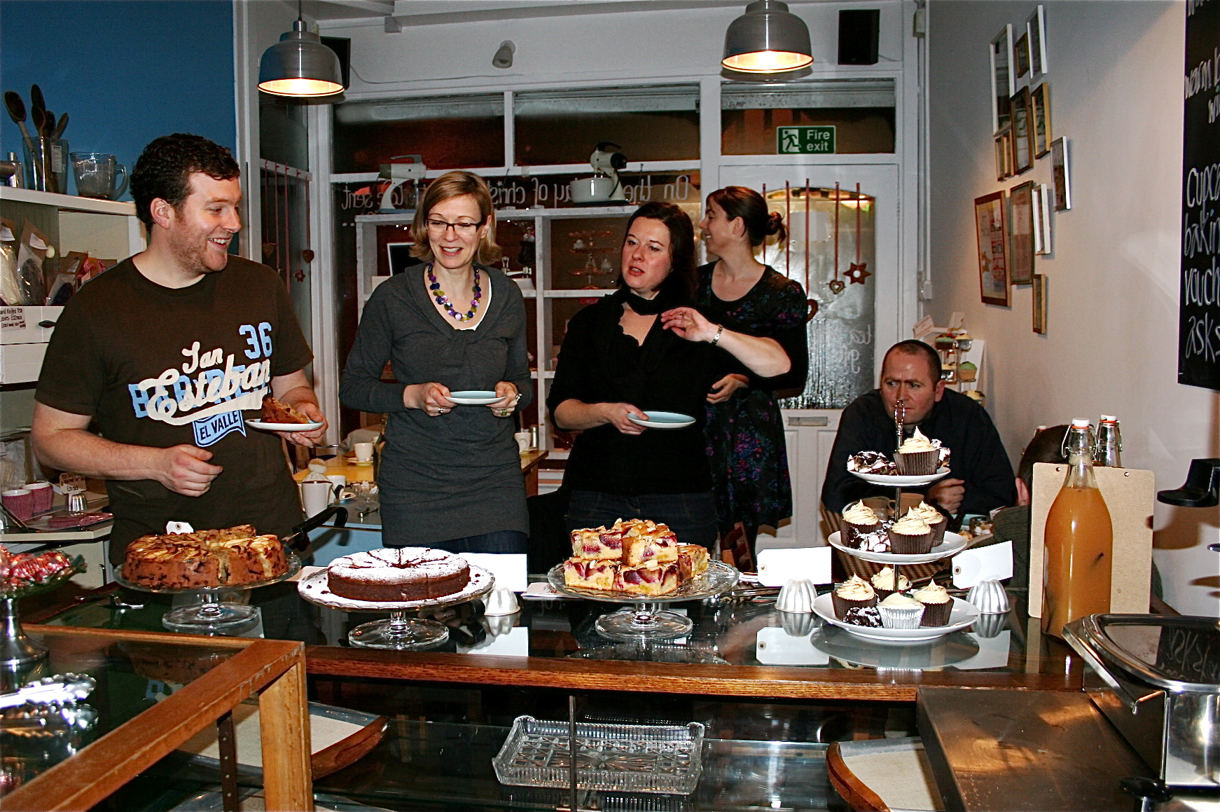 The windows were all steamed up on a very cold Sunday at And The Dish Ran Away With The Spoon, West Didsbury’s newest business, a delicious little bakery run by Anna Gill. Elen, my sweet toothed friend, and I joined the other red nosed, glowing panel members and took our places at the lovely 50’s style tables to Get Cakey. The great thing about being a taster was that I tried things other than my regular favourites. I’m a chocolate / vanilla type, rarely plumping for anything fruity but the Apple and Amaretto pictured above was moist, subtle and delicious. There were four other puddings to try: a Chocolate Amaretti Torte, Xmas cupcakes, Festive Rocky Road and a Plum, Almond and Marzipan slice, and the eating commenced….