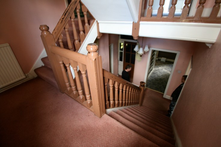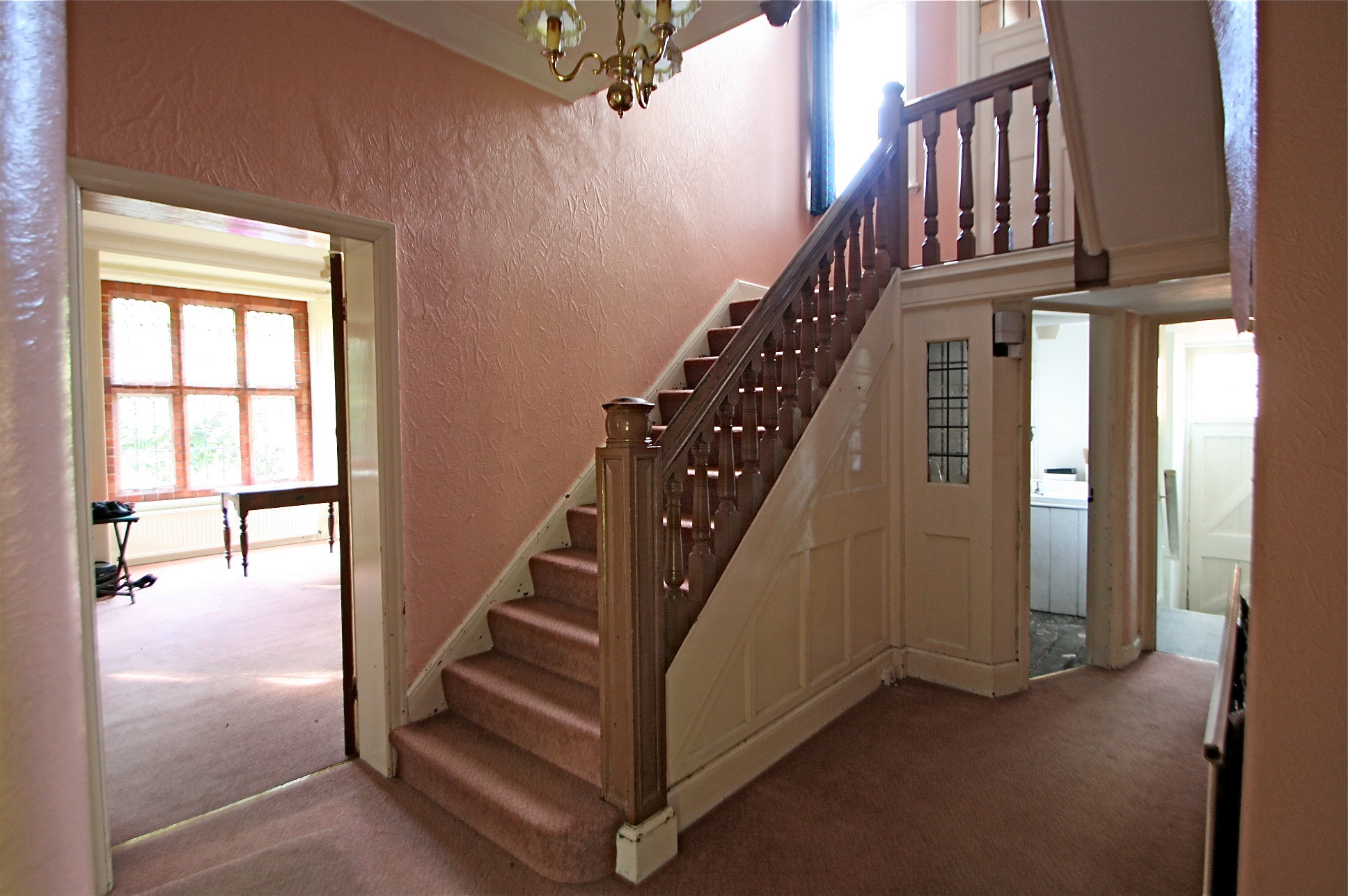 The entrance hallway is huge. All the paper has been stripped and the newel posts are to be stripped and sanded, with new carpets and extra wall lights added. The little room under the stairs is to be a downstairs cloakroom.