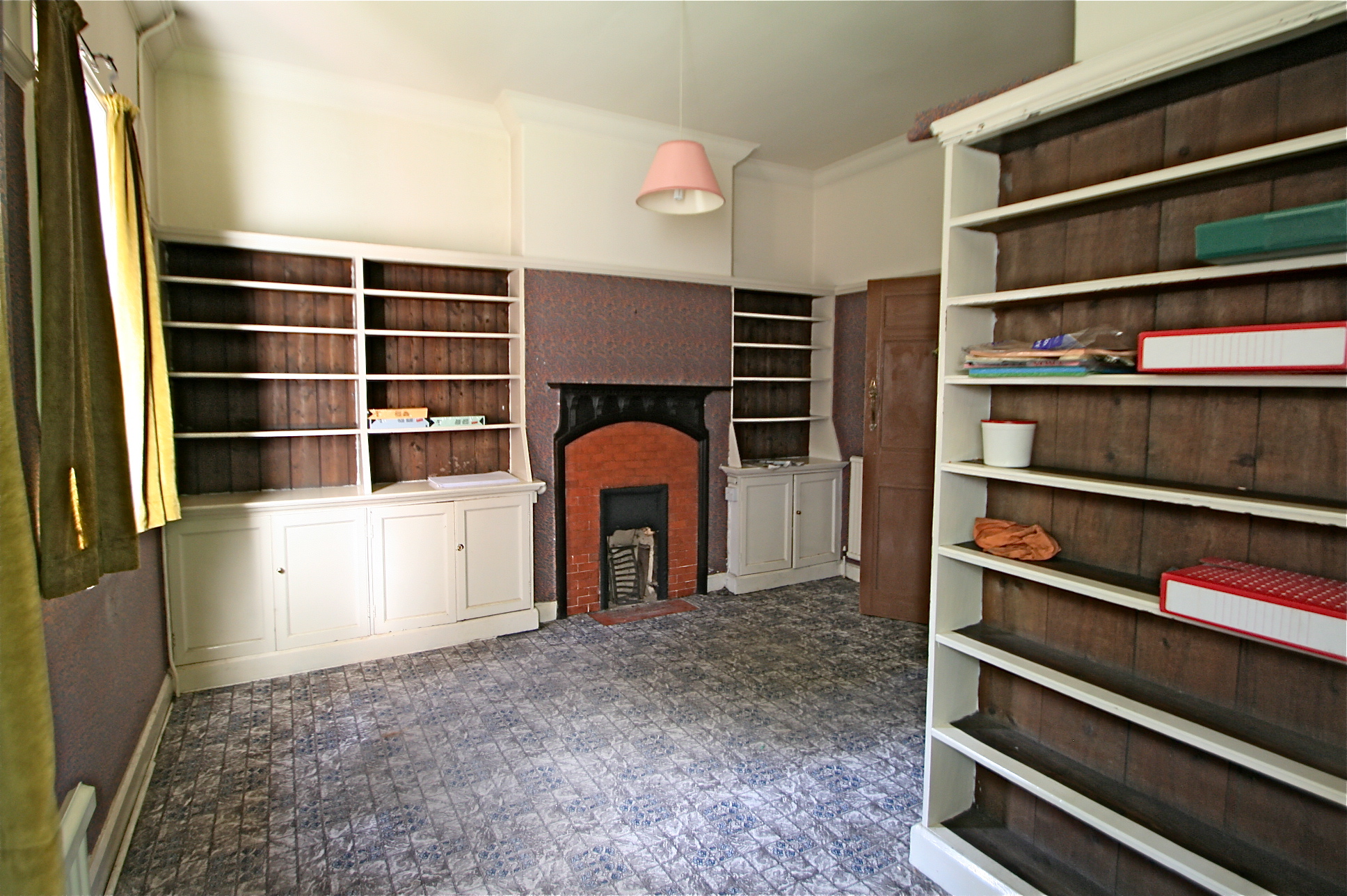 The study was jam packed with shelving which the designers had spec’d to be removed and when we did there was no plaster on the walls, no wonder it was freezing cold! New rad in here, complete plastering and skimming, keeping the existing period fireplace, losing the green curtains and pink lightshade!