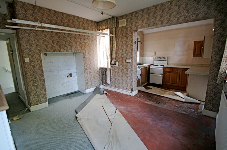 Eek, the kitchen! Look at the size of the room and all the units are stuffed into the far corner, methinks a stunning Ferrious kitchen will definitely glamorize this room and give it the wow factor. It’s all to be stripped to brick and replastered, the uneven terracotta floor is to come up, the chimney breast opened ready for the oven unit, the ceiling dropped and replastered with halogen spots fitted. The kitchen will be positioned in this larger area and the rear section will house a small table for breakfast style eating. I think I’d have run underfloor heating under the new tiles but the budget dictates under plinth heating instead, you can’t have everything!