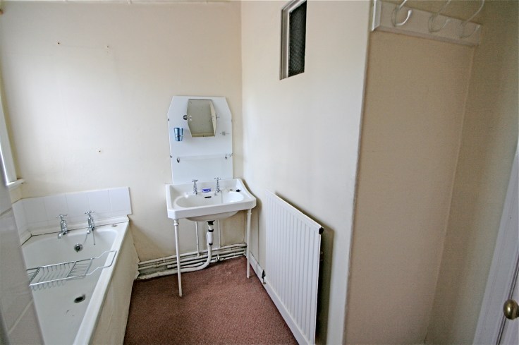The solitary bathroom (below) for this huge house is to be transformed into a luxury family bathroom, and an en-suite added off the master bedroom, with cloakroom on the ground floor. In the room below the walls to the right of the image with the radiator on have been removed and that’s where the new bath will be, the basin moved over to the left and a separate shower cubicle is being installed to the bottom left area of the image. The loo is in a separate room just next door.