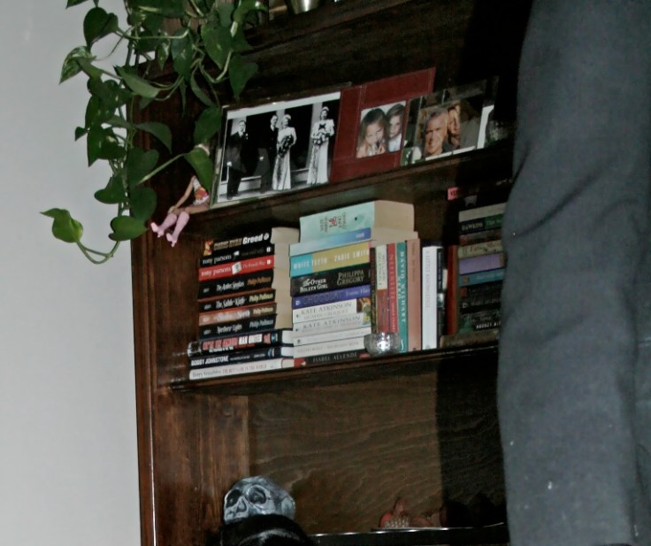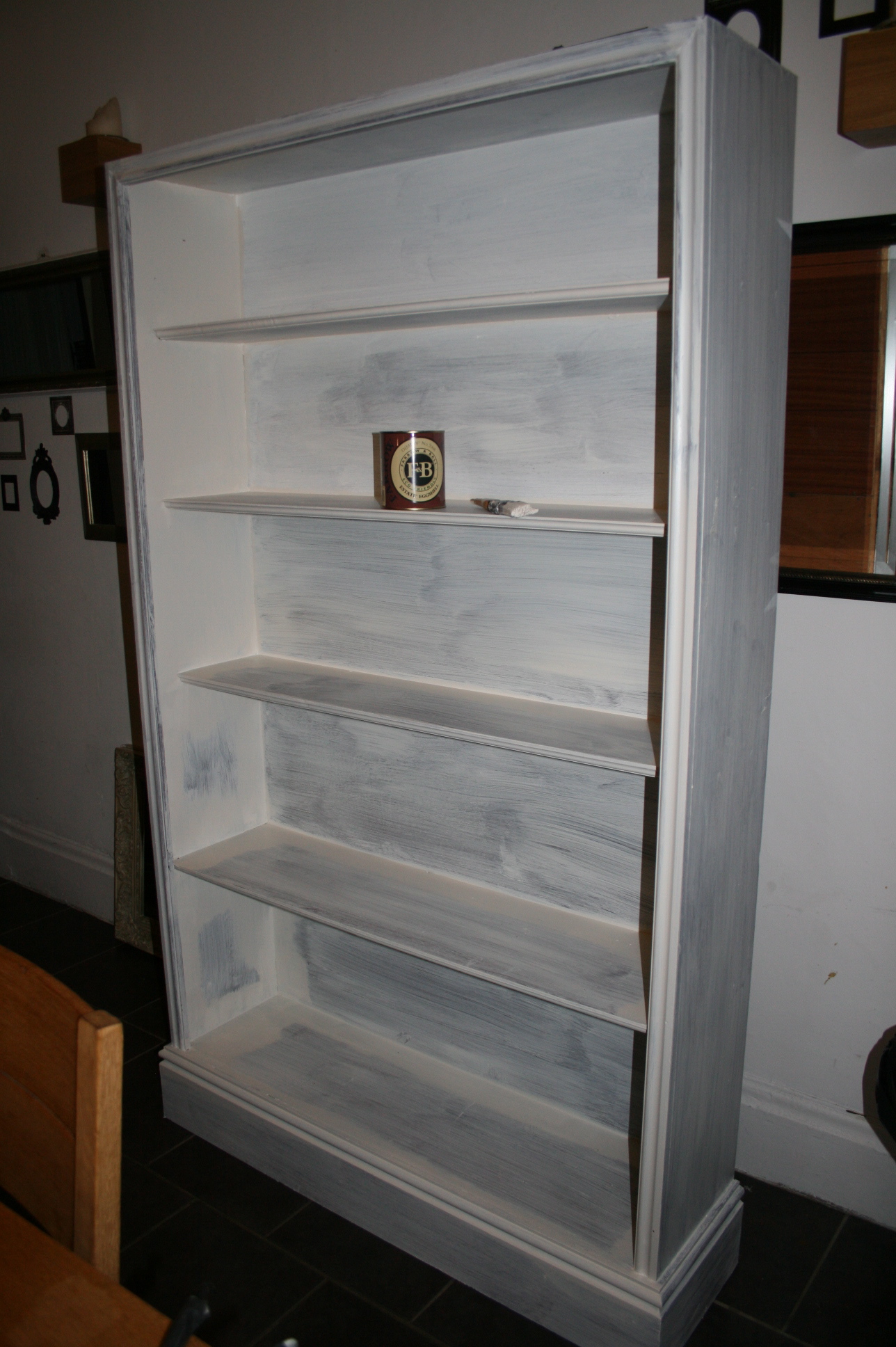 “Er yes, why else did we spend an hour in Farrow & Ball picking paint yesterday?” His eyes rolled as paint pots were popped open and wallpaper strips were measured. It was half a job to finish as I’d already cleaned and sanded down the old bookcase, a remnant from the students who used to rent our house, months ago. To give you an idea of how hideous it was, this was the badly stained colour before….