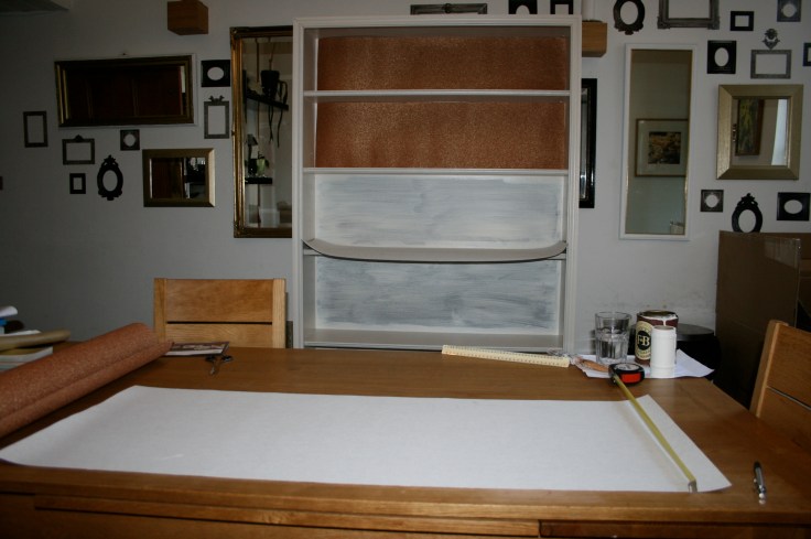 I started by measuring the back sections and marking out the wallpaper which was a Brian Yates copper glitter paper I’d got left over from a previous job. This paper is fabulously thick, more like fabric, and also is 90cm wide so  I could get two strips out of each width. Use very sharp scissors to prevent raggedy edges and I cut the strips slightly wider than needed then trimmed them carefully down, better too high or wide which can be corrected than too small.
