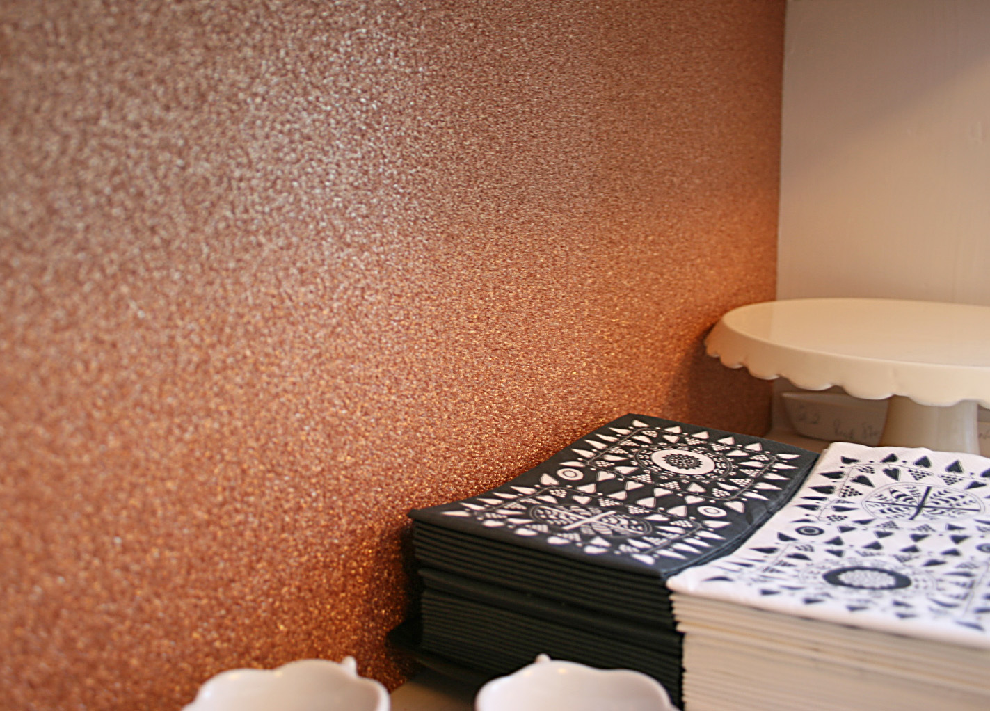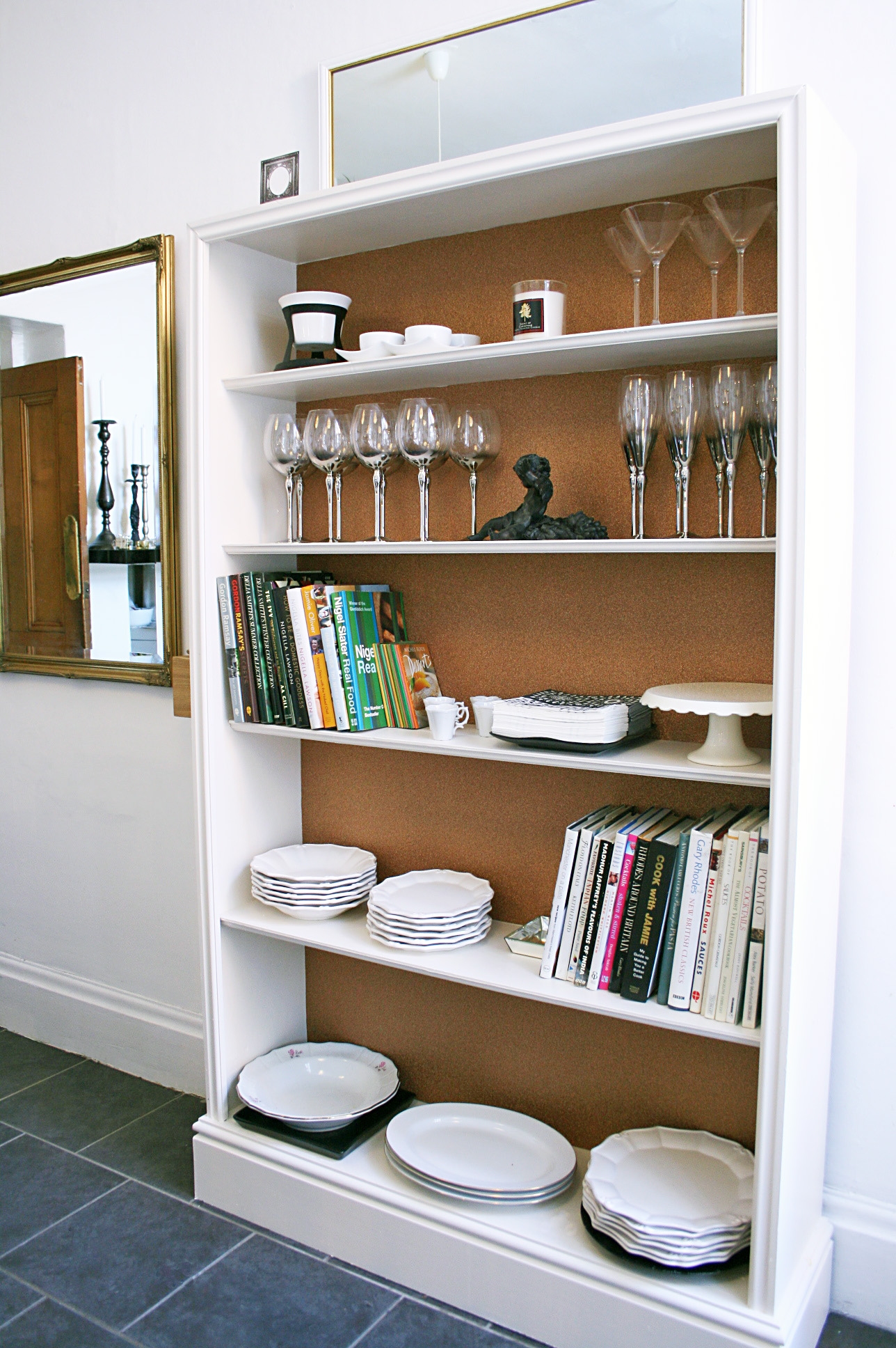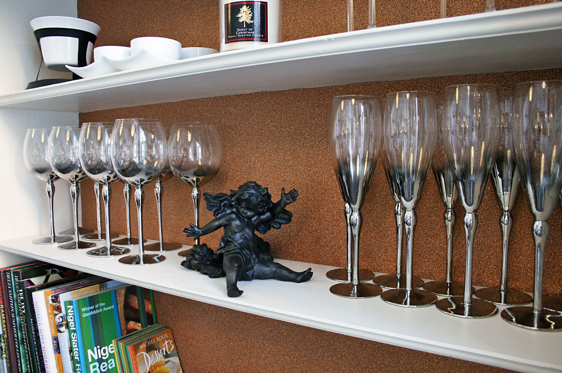 The bookcase was given two coats of the Dimiti waterbased eggshell, tough but fast drying, then I stuck the paper to the back walls. When and if I get bored of the copper paper, I can simply peel it off and pop a new backing in, constantly updating my upcycled bookcase – perfect. After just a few hours work, I could stop stuffing my kitchen units with glasses and move my cookbooks away from the oven, even the chocolate melting pot came out, just for Christmas, you understand. I’ve a feeling those martini glasses might get used a little more often now they’re not stuck in a box at the back of a cupboard 😉