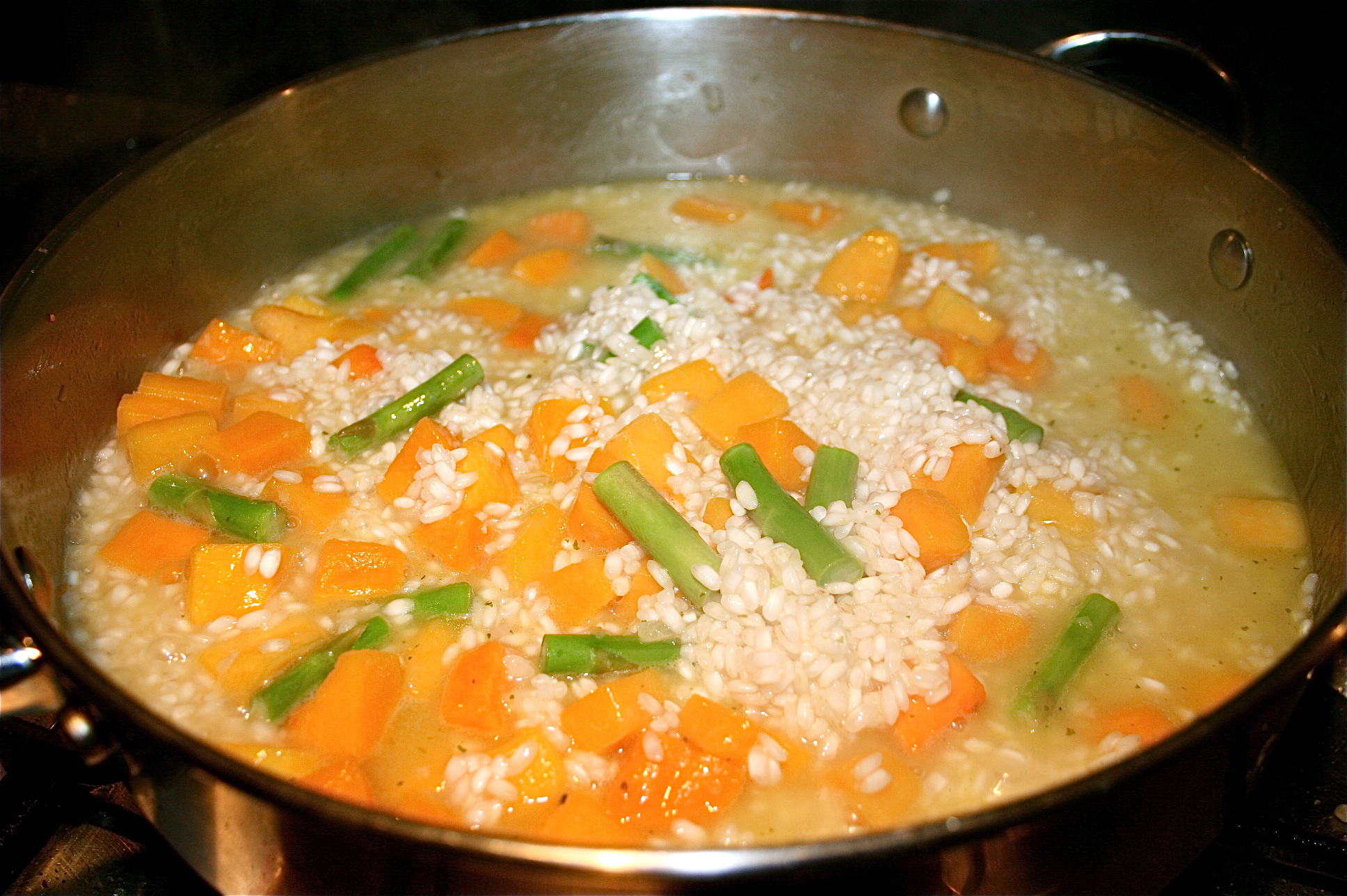 Pack of arborio rice, cook as usual risotto but I added half a butternut squash cut down into bite size chunks and the twiggy ends of the asparagus just after the wine had evaporated. I used one veg and two chicken stock cubes diluted and just kept adding til almost cooked. At that stage took out the woody asparagus ends (which had given a bit more flavour) and added in the chopped up remainder of asparagus spears. Added a know of butter and few teaspoons of parmesan and let stand whilst I flash fried the beef, which I’d marinated for an hour in lemon & chilli flakes, then added Greek Basil (small leaves) at the end and served on the risotto x