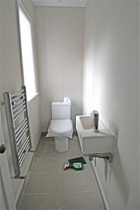 The bathrooms are in and tiled but not finished off yet, and as you can see the designers have opted for a contemporary feel for us to fit. There’s a separate shower cubicle in the family bathroom, the porcelain tiles have been laid to perfection and a little wing to the bath means a much comfier head as Ms Tenant lies back to read her Grazia 🙂