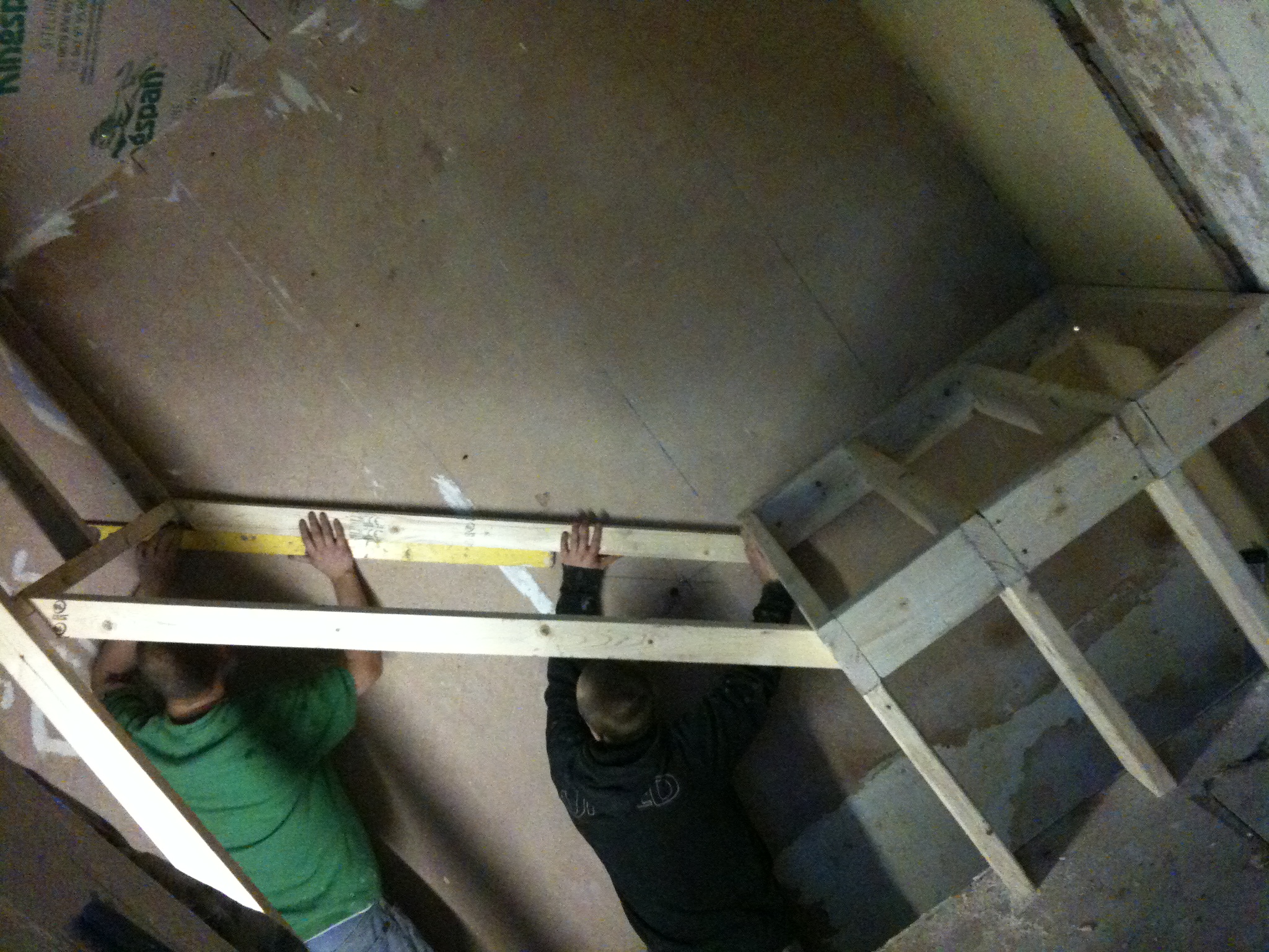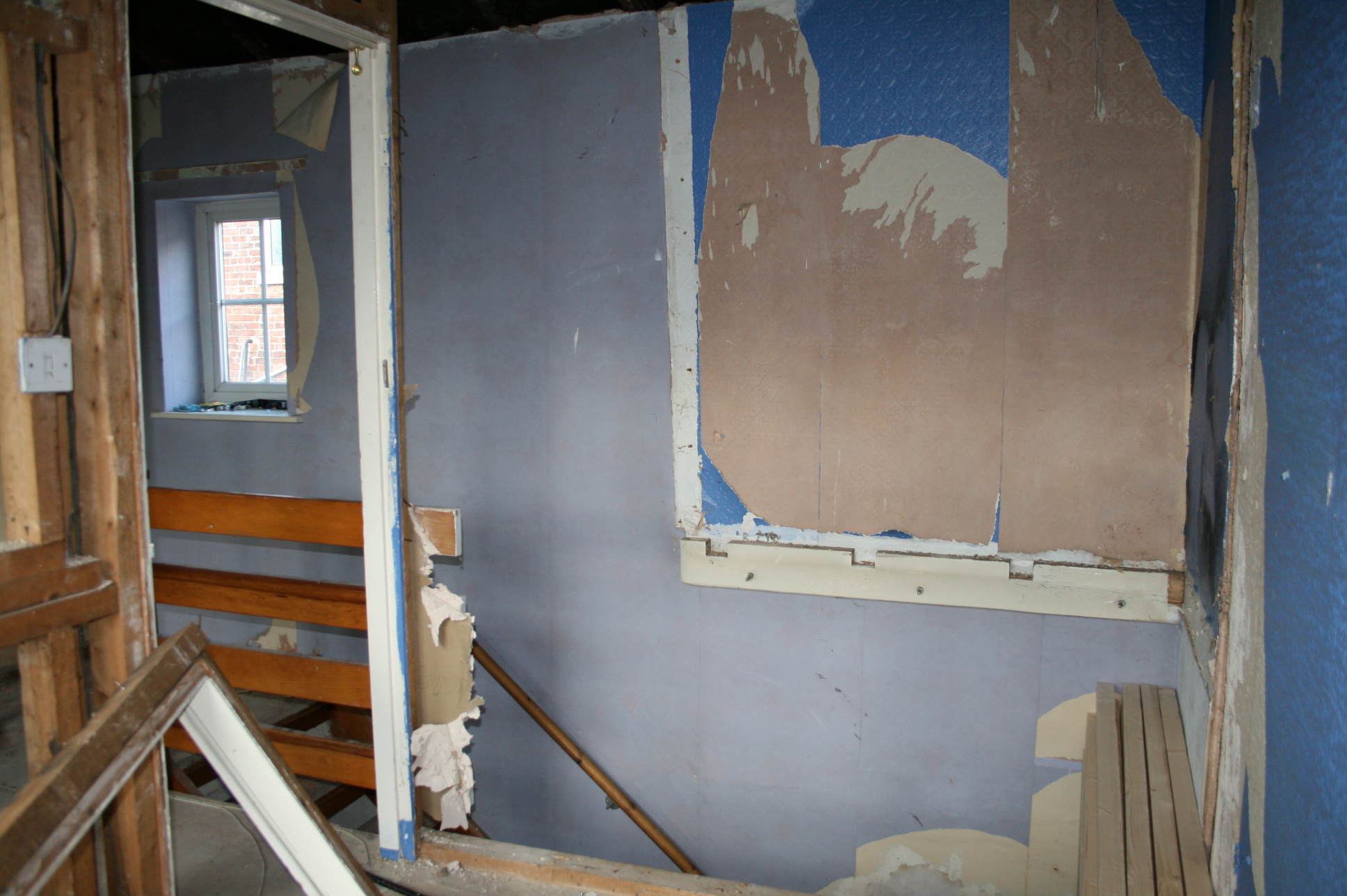We got to work constructing the basic frame which would be the ceiling to the stairs below and also the base of the bed above, this is the view from the landing before the hallway / bedroom dividing wall was built…
