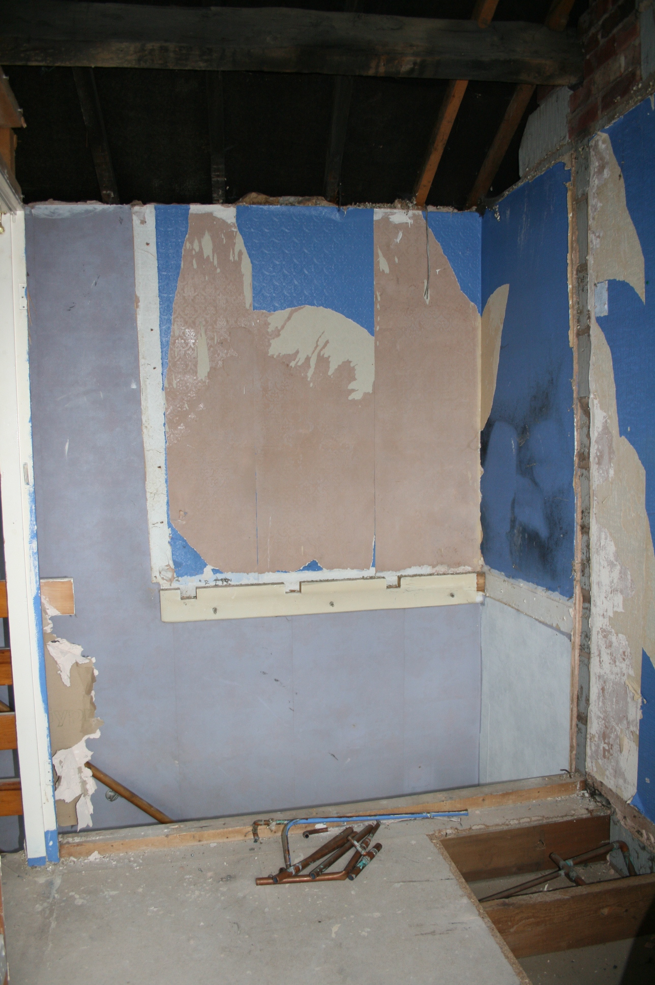 Sometimes space is so tight in a room that innovative thinking is the order of the day, and this was certainly the case in the second bedroom at Rose Cottage. When Hannah first viewed the house, this room didn’t even have a bed in it, just a sofa contraption and it was very, very cramped with no space for drawers or a desk. The area you can see in the image above where the head of the new bed and shelving are positioned is over the stairs, where a waist height cupboard had been built in by the previous owner. An idea began to germinate in my head and I asked the lads to rip out the existing cupboard (sorry no pics) and leave the space below. Down came the ceilings as well, at the same time. My idea was to create the deck to allow a full size single bed to fit in the room, with half of it positioned over the stair area, allowing storage underneath, shelving next to it and therefore space in the rest of the room for a small wardrobe, drawers and a desk. By taking the low ceiling partially down and opening it up to the roof line, the area directly over the bed would feel roomy and spacious. Now I just had to persuade everyone else it was a good idea… the words Bed deck? Bed Deck?! resonated round the cottage whilst they came round to my way of thinking, but they did, eventually!