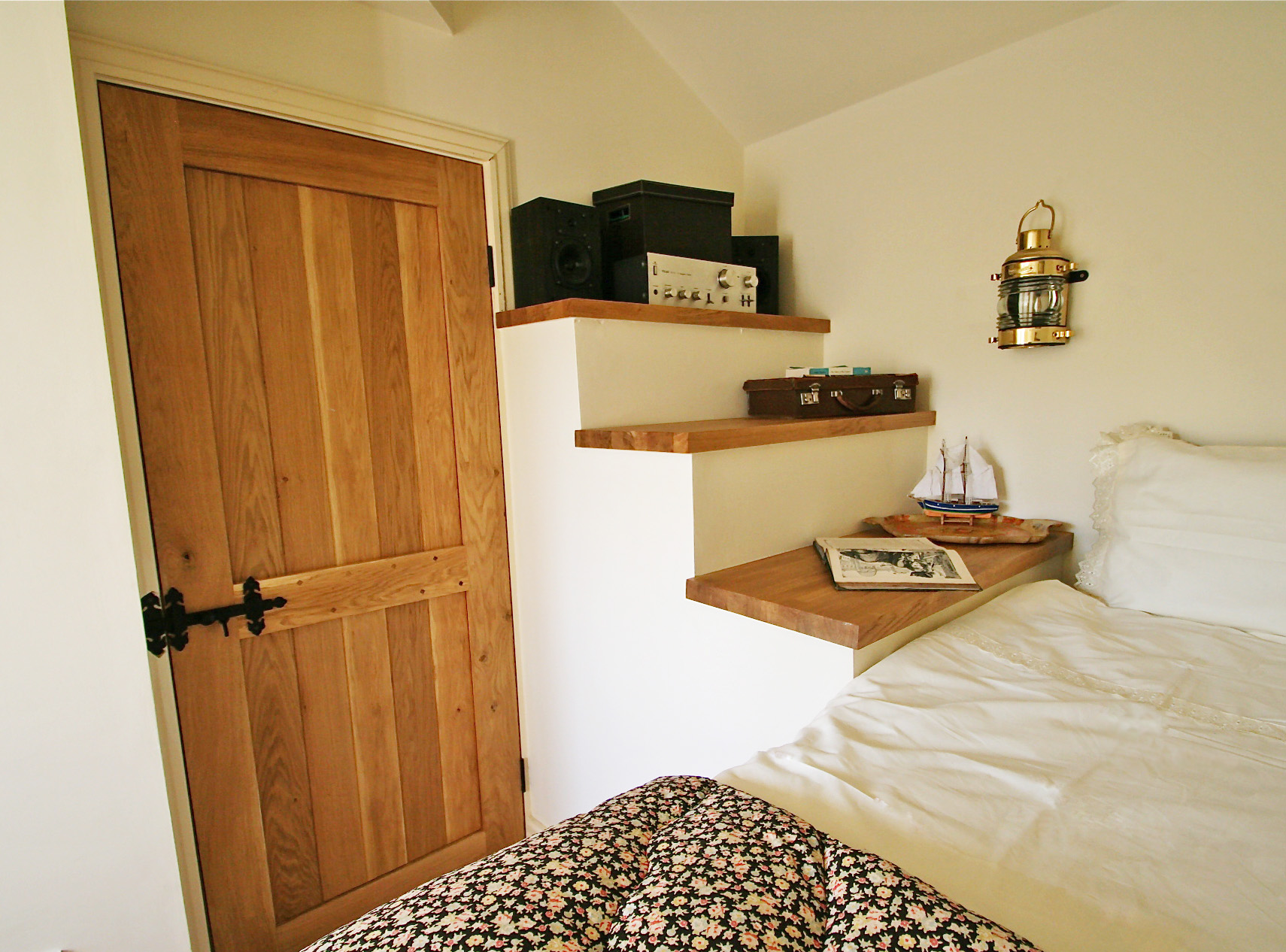 This continued using timber framework to create the step effect (sorry no pics of this stage!) and then also the bed was extended into the room to be approx 2m long and loft board used on top of the joists. The framed area round the shelves was then strengthened using double plasterboard so it could be painted with emulsion. I used off-cuts left over from the solid oak kitchen work top to make the shelving, sanded the edges then varnished to protect against water marks etc. In an area where little else could be fitted to the wall due to it’s sloping nature, the step effect created a great use of the space. Make sure you fit a double socket above one of the steps for stereo / chargers etc, and we included wiring for a bedside light too.