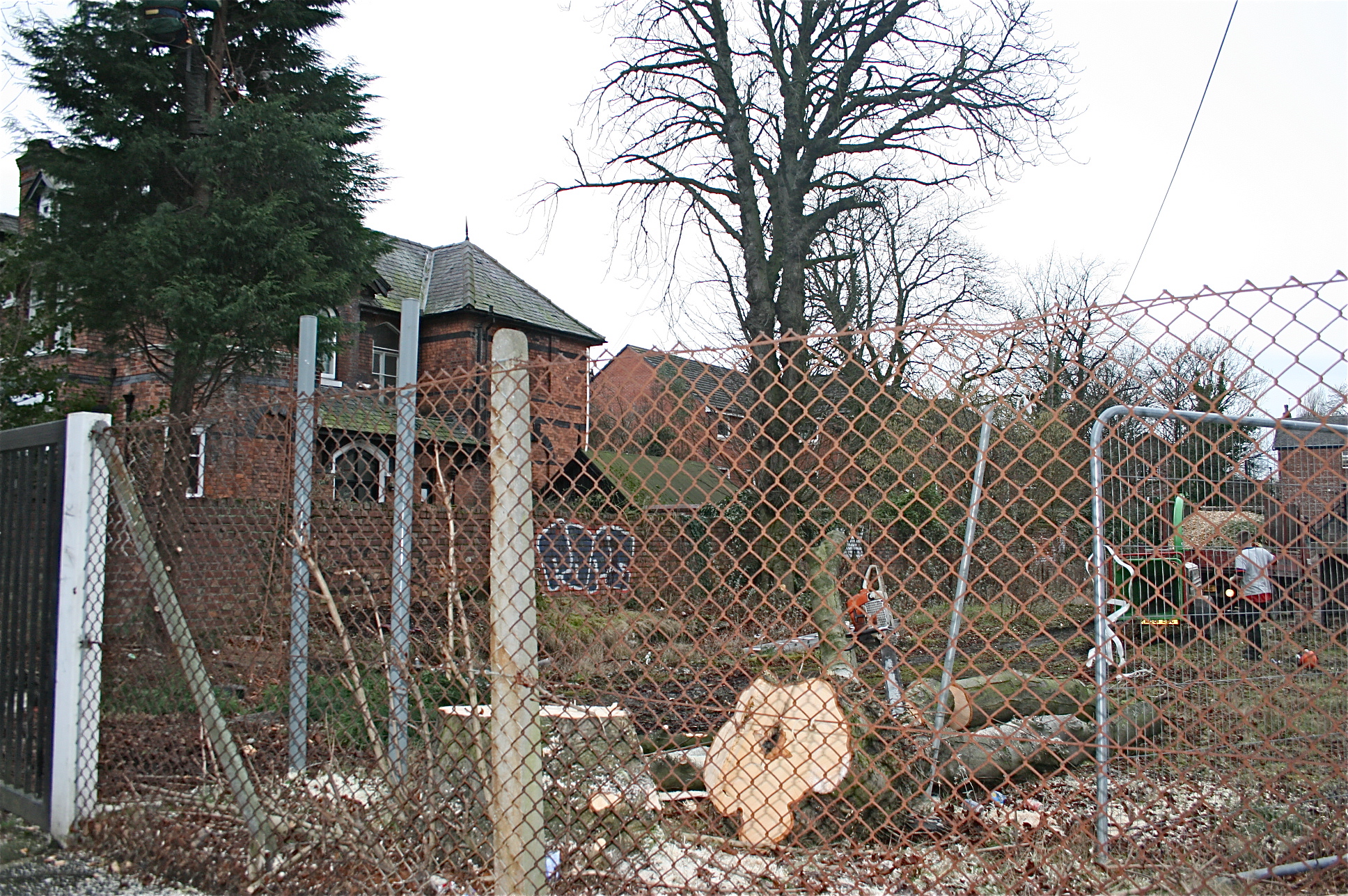 So, please note, planning hasn’t been granted. No-one really knows what is going to be built on the site. Horrific then, that this week Watkin Jones contracted workers who set about felling every single one of what was a site filled and surrounded by 16 mature trees and other less established trees too. Despite the intervention of planning officers trying to negotiate the retention of some periferally sited trees, and a verbal assurance from Jason Berry, from Watkin Jones, given to both planners and local residents  that he would visit the site and suspend the activity, no such visit took place and the destruction continued. Indeed, in an act of pure vandalism, one operator, angered by the presence and arguments of planners,  residents and one councillor, took his chainsaw and successfully ‘ringed’ six more mature trees, designated for felling on the W.J. Plan (as yet unapproved) and  still standing up til this week.