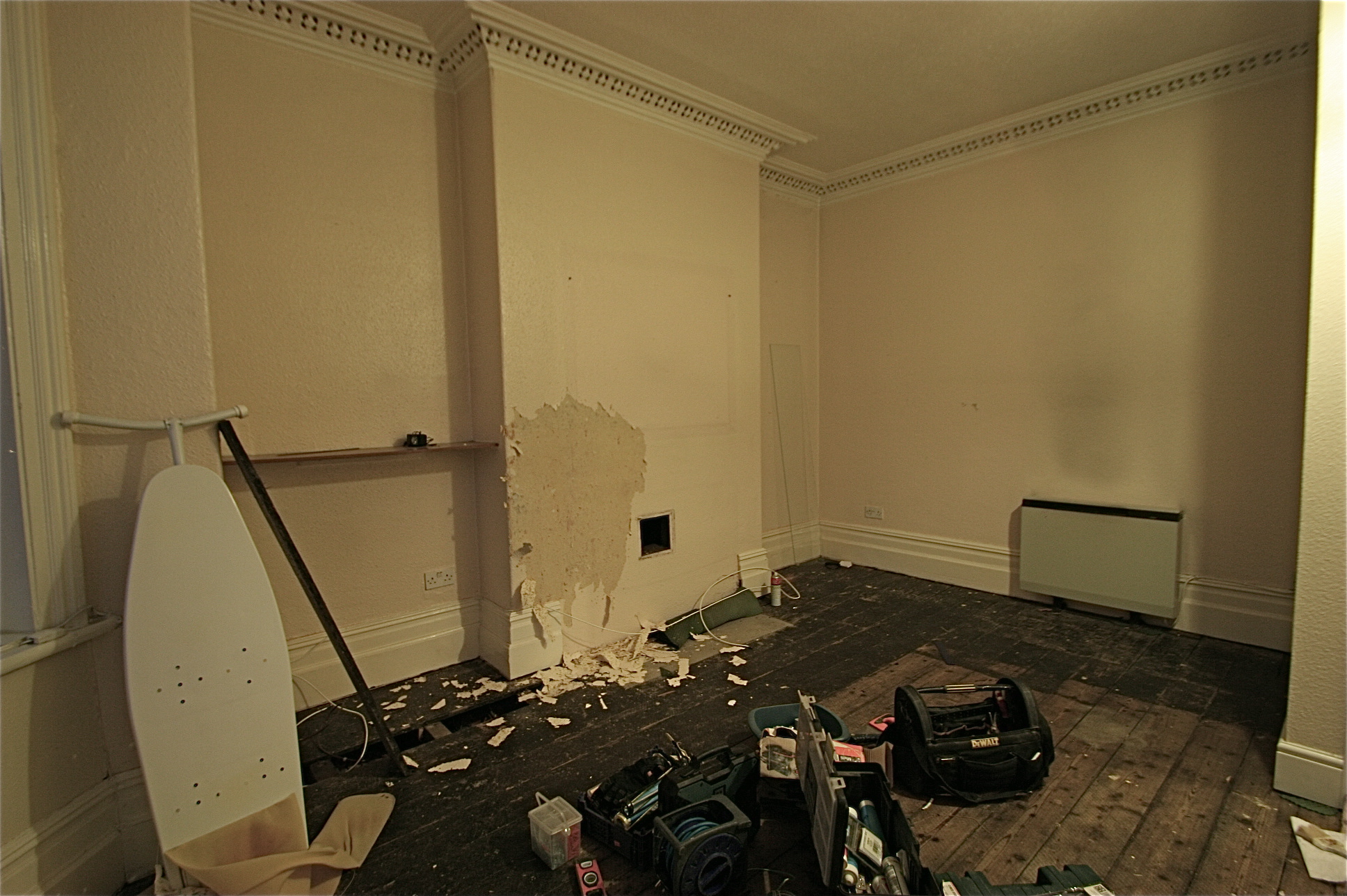 Lots of stripping going on today at Project Pizza after the tenant moved out at weekend, we don’t mess around here you know! It’s been planned for ages as the tenant was supposed to move out last October, good job as I am not 100% at the moment so just as well my plans were already in place. There’s nothing structural but lots of new stud work, opening of fireplaces and replastering using insulated plasterboard for extra warmth.