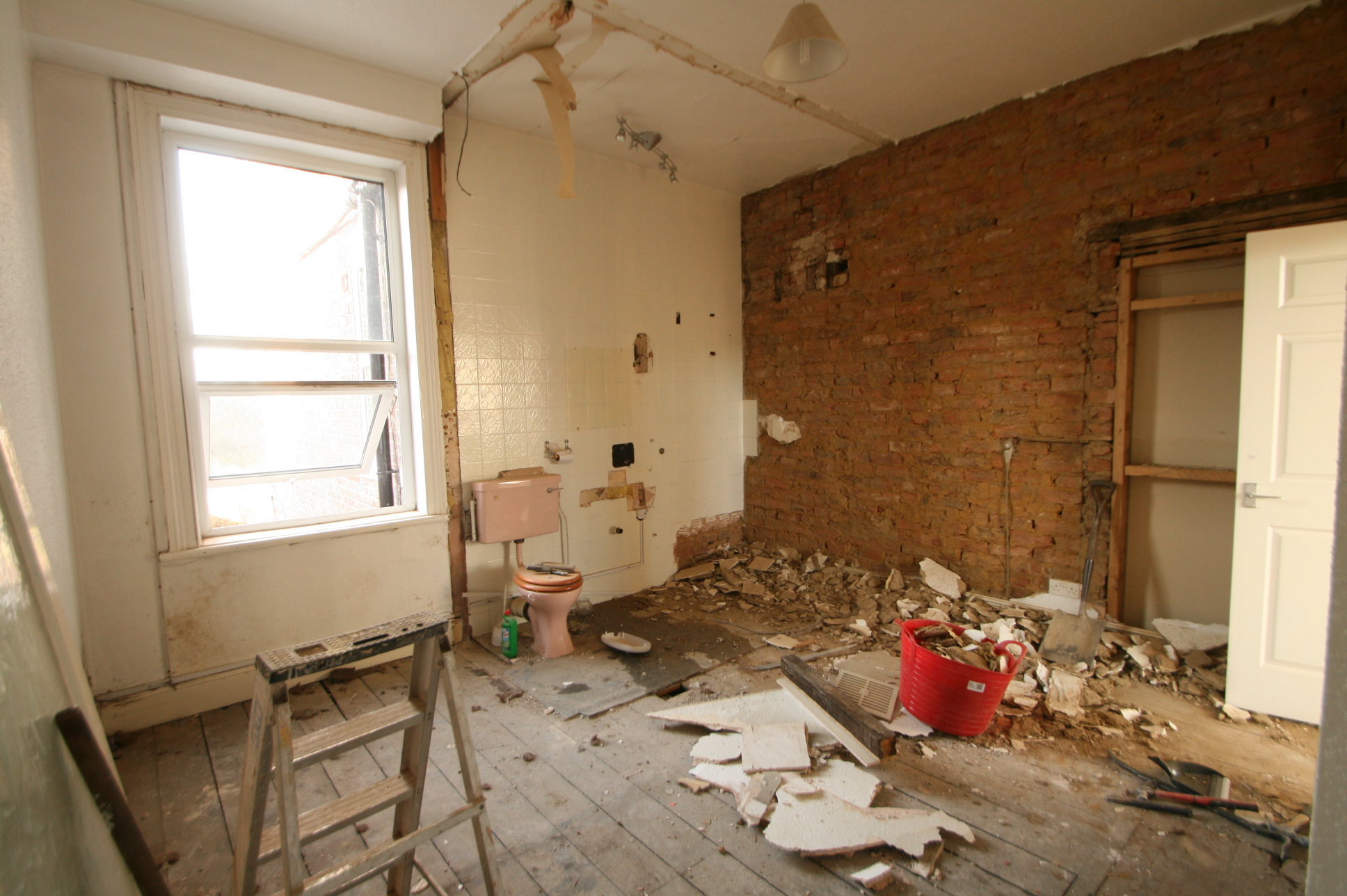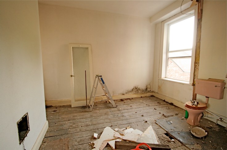 ….leaving just the pastel pink loo standing forlornly on it’s own surrounded by falling plaster. I’m going to completely alter the shape of th en-suite to make the whole room much more liveable and spacious, and the bare walls are to replastered using insulated plasterboard to make the apartment not only warmer but better sound-proofed as well. That bare wall you can see above has the communal hallway on it’s other side, no wonder you could hear everyone walking past through that boarded up door which had no insulation in it at all, terrible job.