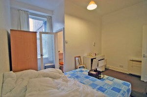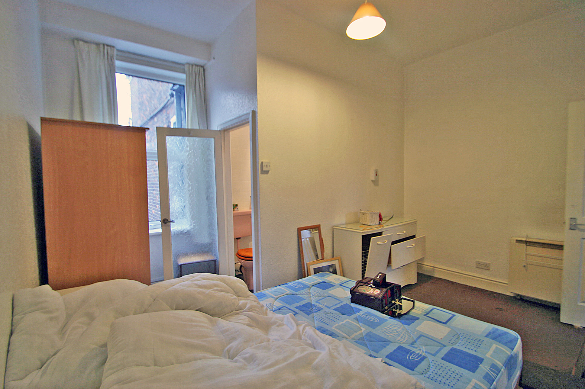 The old bathroom and stud walls were removed and the bedroom ceiling dropped by 150mm and insulated to provide sound protection from the upstairs flat. Then a new en-suite was built in a shape which still allows a 900 x 800 shower, loo and 600 basin but feels far less intrusive in the room.