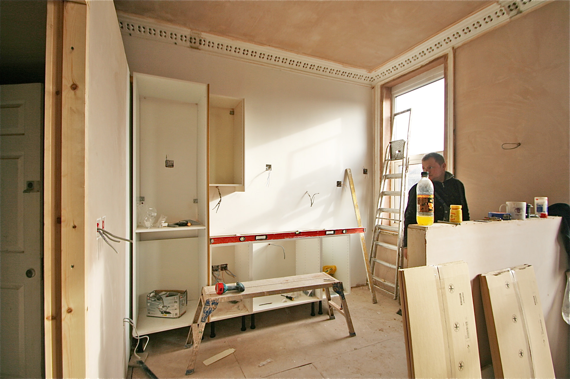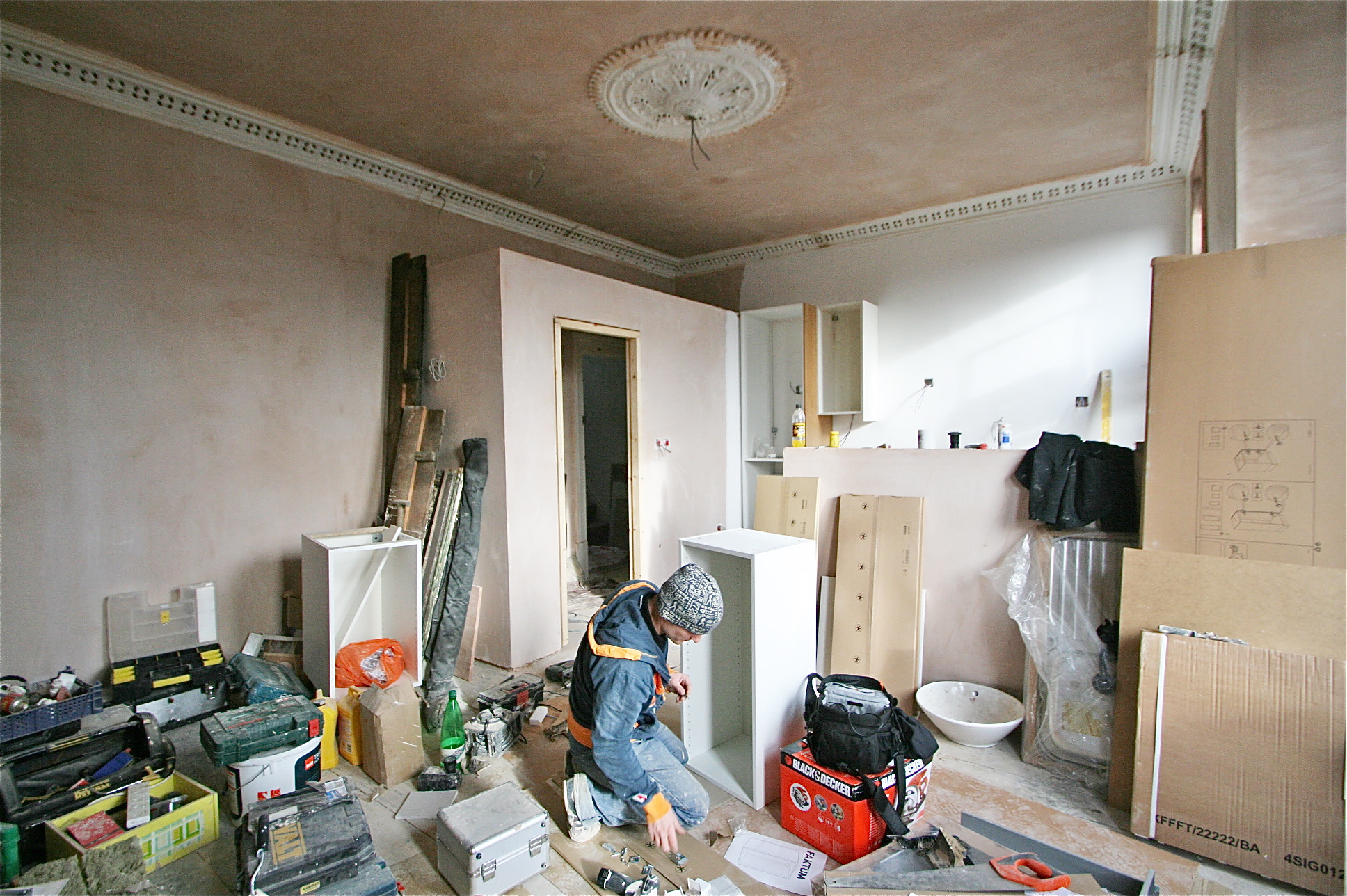 The area above was the old kitchen but it was studded into a small space, so down came the wall to form a living / kitchen area. I’ve had them build a partial wall which you can see in the foreground, behind which the sink goes. I know may developers / landlords would have just put the kitchen on the one wall at the back but, well, that would have been a bit crap, so I didn’t / don’t make decisions like that. Costs extra but you get it back in decent rents and no voids.