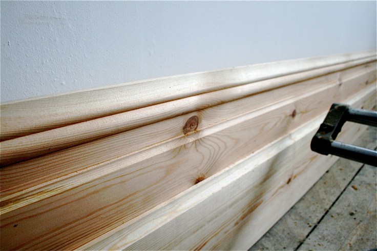 Unusually for a rental apartment refurbished in the 70’s, Project Pizza has retained a handful of original features, namely the extravagant ceiling rose in the living room, the elaborate coving (see below) and finally the only remaining extra height original skirting boards in the building, which I really wanted to keep. It had been ripped out in the bedroom and hallway but I though there would be enough for the living room…. wrong!! By the time we’d taken off the old plaster and put new thermal board on the walls, then jigged about with the fireplace, we were short by about 4 metres, dagnamit, and it certainly wasn’t the type of skirt you could pick up in B&Q or even a specialist timber merchants.