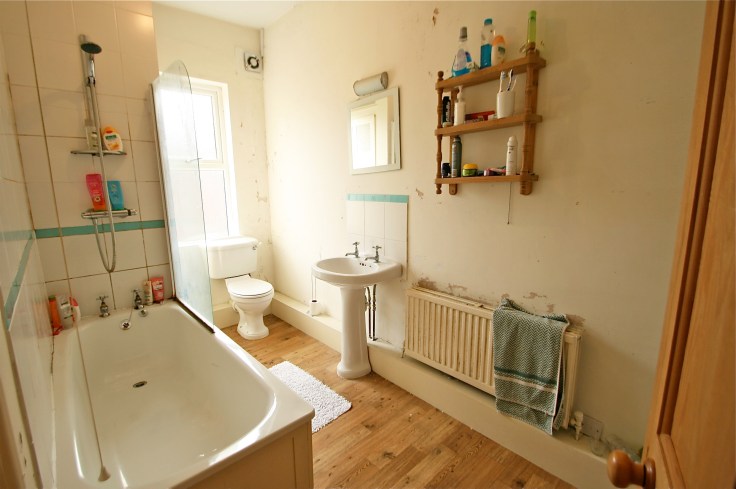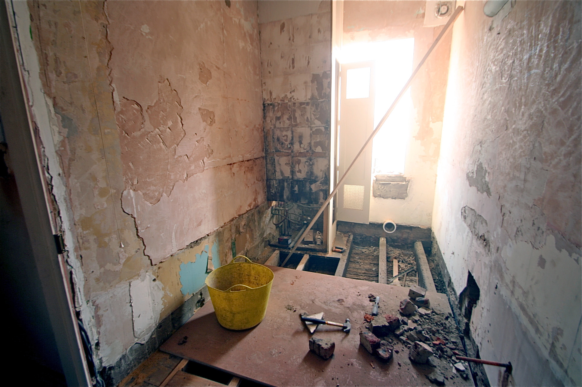 There actually wasn’t an awful lot ‘wrong’ with Project J’s bathroom before we started work last week, other than that the wrong paint had been used straight on top of bare plaster / board and had started to peel off in the humidity, plus the radiator needed updating. However, the clients hated their bathroom and wanted a whole new look which was more their style. Ever obliging, the Moregeous team got cracking last week on the space and the kitchen downstairs in this Didsbury terrace and soon the house was unrecognisable. I love this stage of works, the muckiness of it all, but it’s often quite frightening for clients to see their home looking like this, for some a stiff gin is needed both before and after any visit. Luckily Mrs J has a strong constitution and was up for site meets where it’s always easier to make decisions.