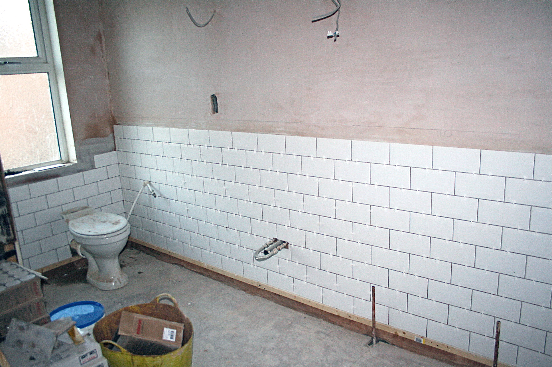 One week later it’s all being put back together and the white metro tiles are on to 1100mm high but not grouted. The black and white period style floor tiles are on site along with all the sanitary ware, taps and shower and it’s full steam ahead. Or not, as I’ve ordered a spanking new extractor fan 😉