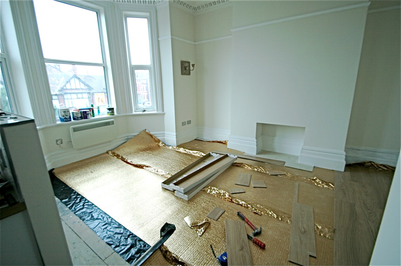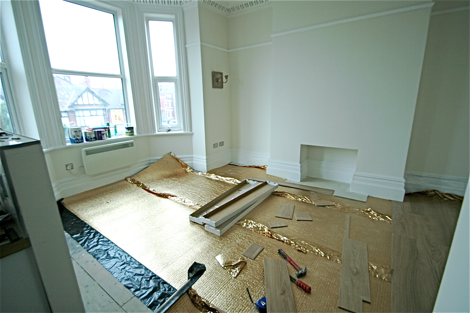 The boys are getting on with fitting the kitchen at J, but meanwhile back at Project Pizza, the last apartment in our own portfolio of rental properties to be renovated, the oak laminate floor is finally going down. To cut down on noise transfer to the flat below, we’ve insulated between all the floor joists and in each bedroom built a lowered then plastered ceiling. As an extra measure I’ve bought acoustic underlay for this apartment. It’s important for me as a landlord to know that tenants are happy in the properties they rent from us, plus it makes financial sense too as happier tenants stay longer. For the bedroom, large living room and hallway, two rolls cost £84 + VAT, which is costly but hopefully will be worth it – never used it before but will be doing a little sound test tomorrow!
