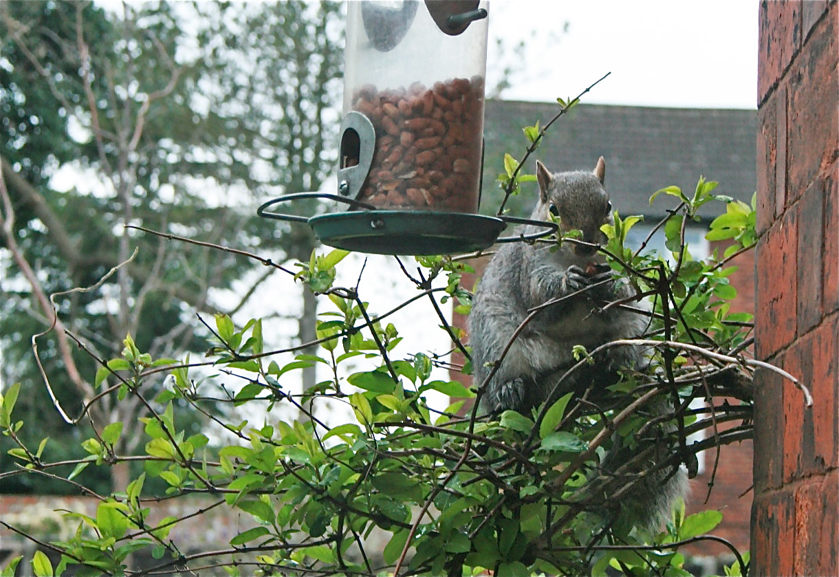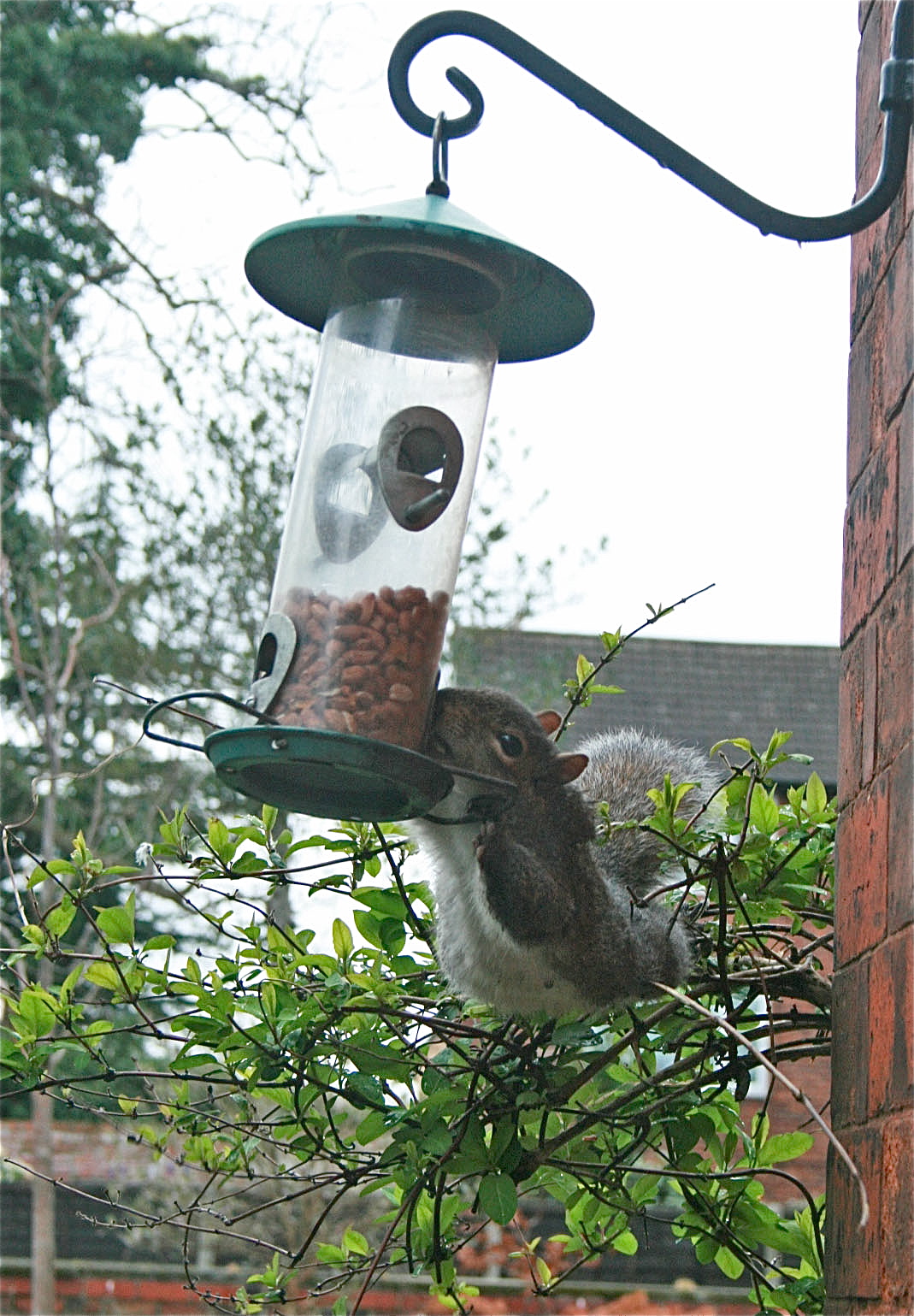 For nearly three years this cheeky female squirrel has been a source of fun in our garden, she comes to take nuts from my hand, sits on the wall watching the boys playing footy in the garden and sometimes even braves the kitchen doors to request more treats. Caught her this morning nicking peanuts from the bird feeder which is very naughty as peanuts give squirrels severe fur loss *gets out drill to move bracket further away from honeysuckle plant*