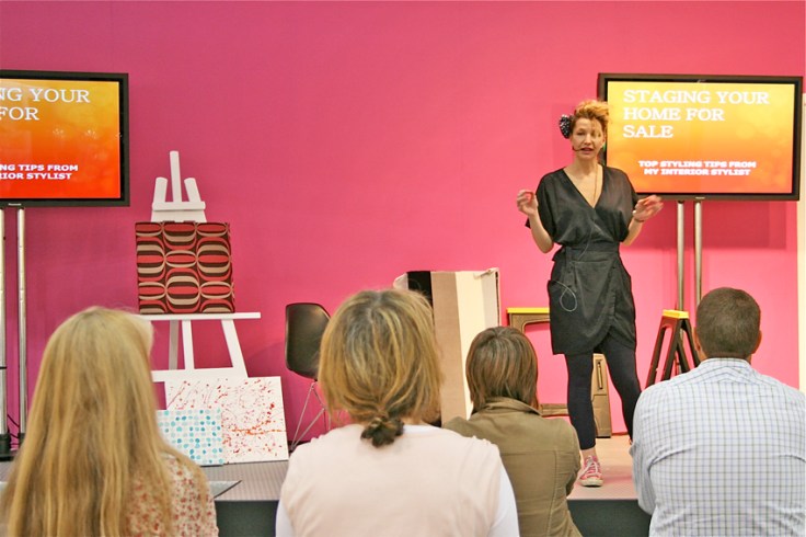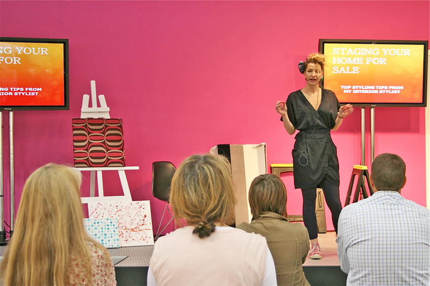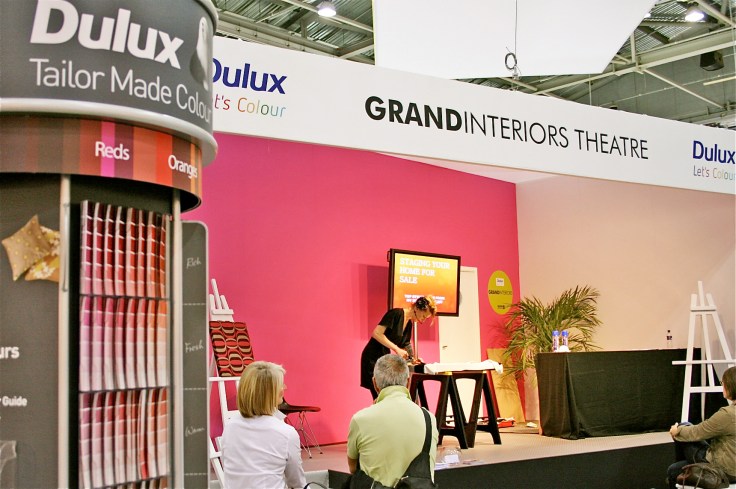 …. then along to the Grand Interiors Theatre, where interior stylist Zoe Brewer was giving tips on how to make a headboard against a gorgeous bubblegum pink backdrop….